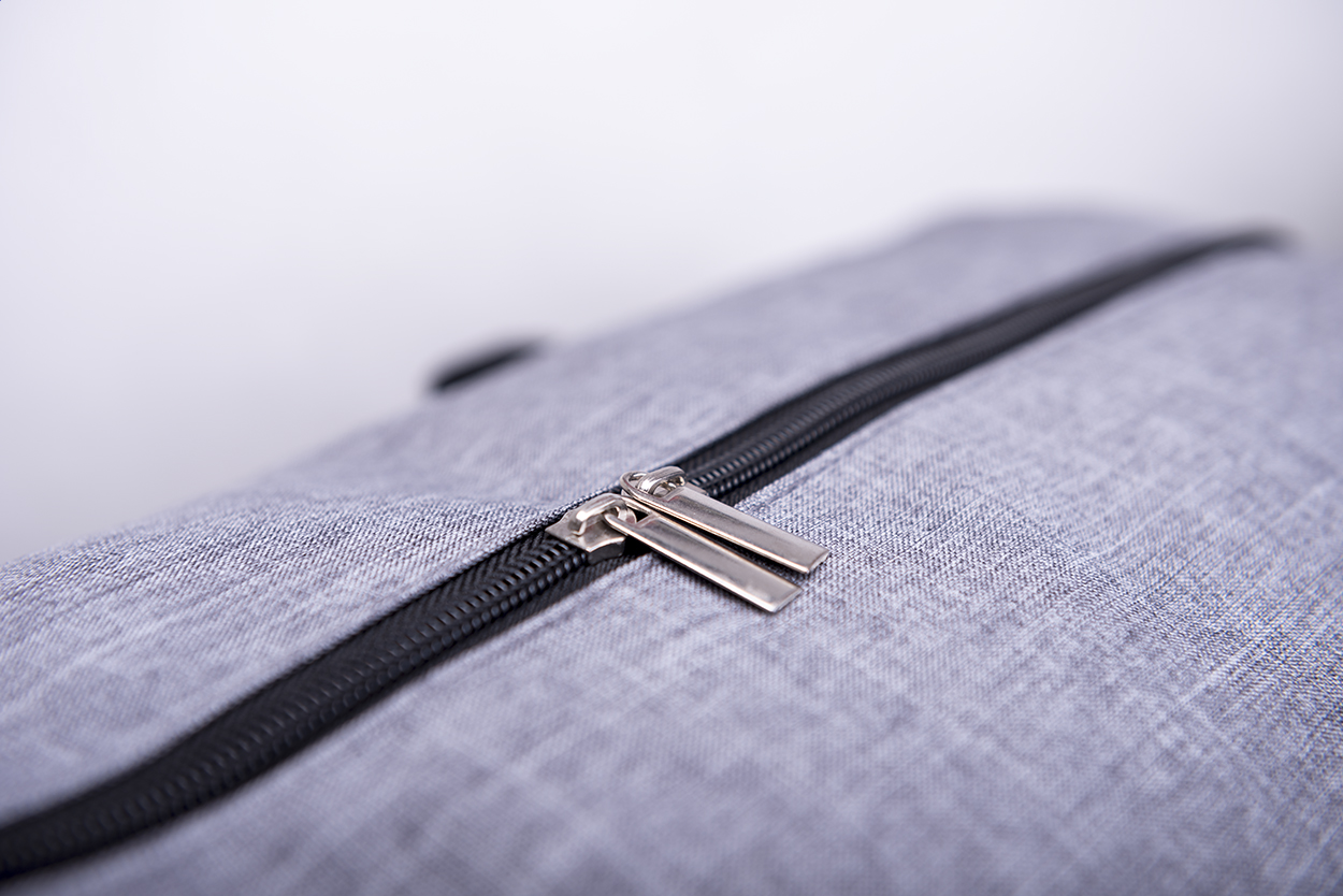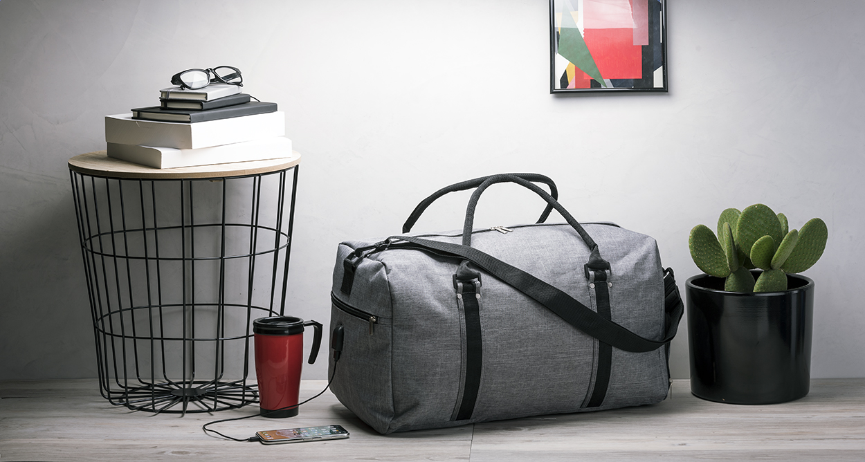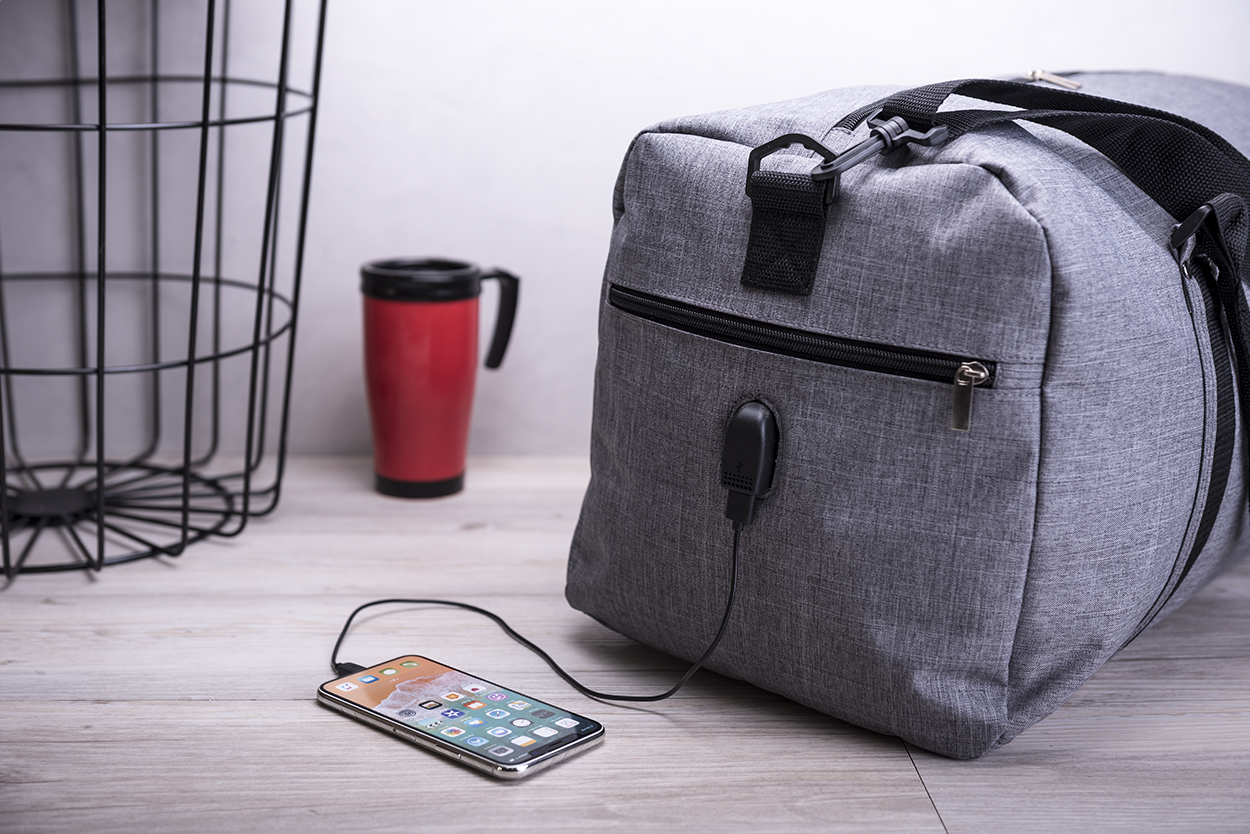 Geantă sport cu fermoar, curea de umăr și conexiune USB încorporată pentru power bank. Poliester 600D.