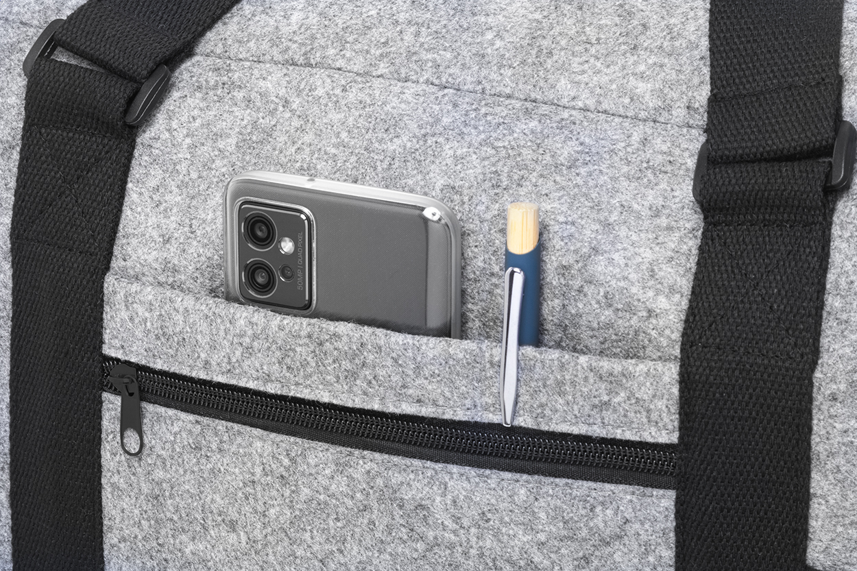 Geantă sport, din fetru RPET bicolor, cu compartiment principal cu fermoar, buzunar frontal cu fermoar și curea de umăr reglabilă. Cu etichetă distinctivă RPET.