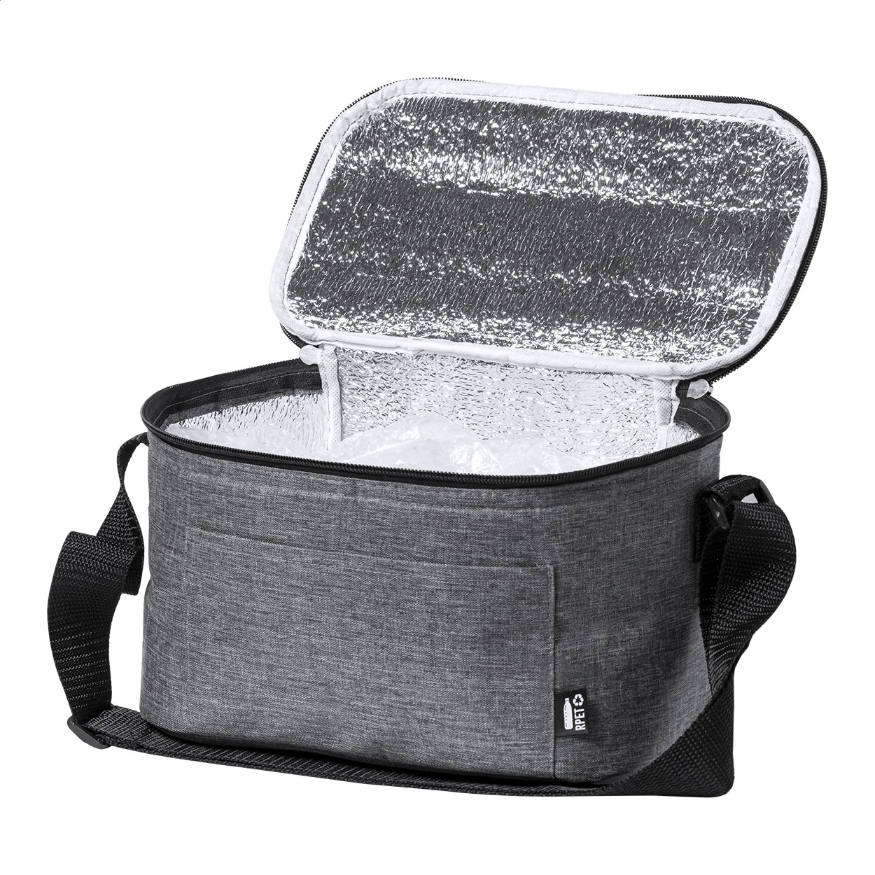 Geantă frigorifică cu fermoar din RPET cu căptușeală din aluminiu, pentru 6 bucăți cutii de 0,33 L. Cu buzunar frontal și curea de umăr reglabilă. Poliester 600D RPET cu etichetă distinctivă RPET.