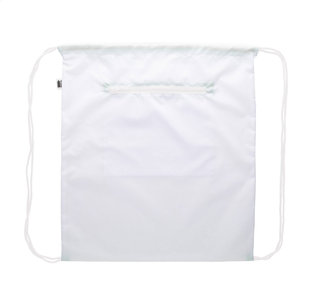 Geantă personalizată cu șnur cu fermoar, buzunar frontal protejat RFID, poliester 190T RPET. Cu grafică imprimată prin sublimare și etichetă RPET distinctivă. MOQ: 25 buc.