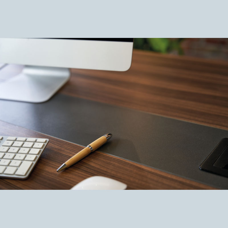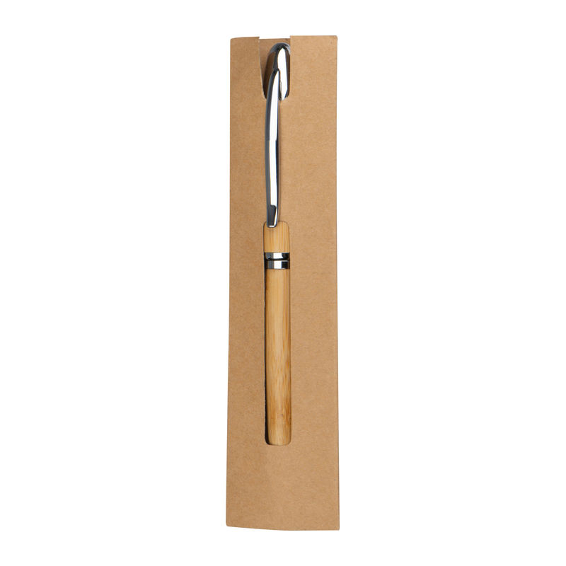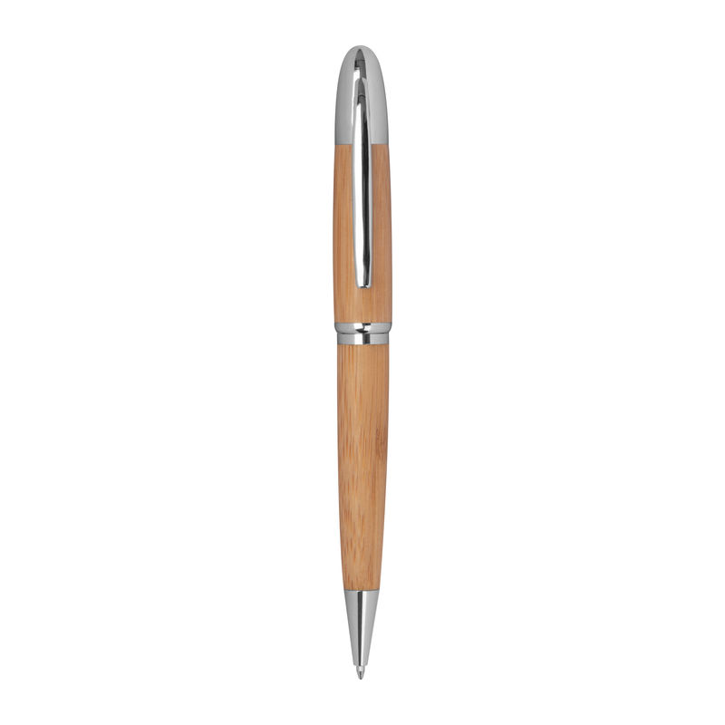 Metal twist ballpen with bamboo coating, blue-writing refill, and silver applications. Your advertisement will be engraved to the right of the clip.