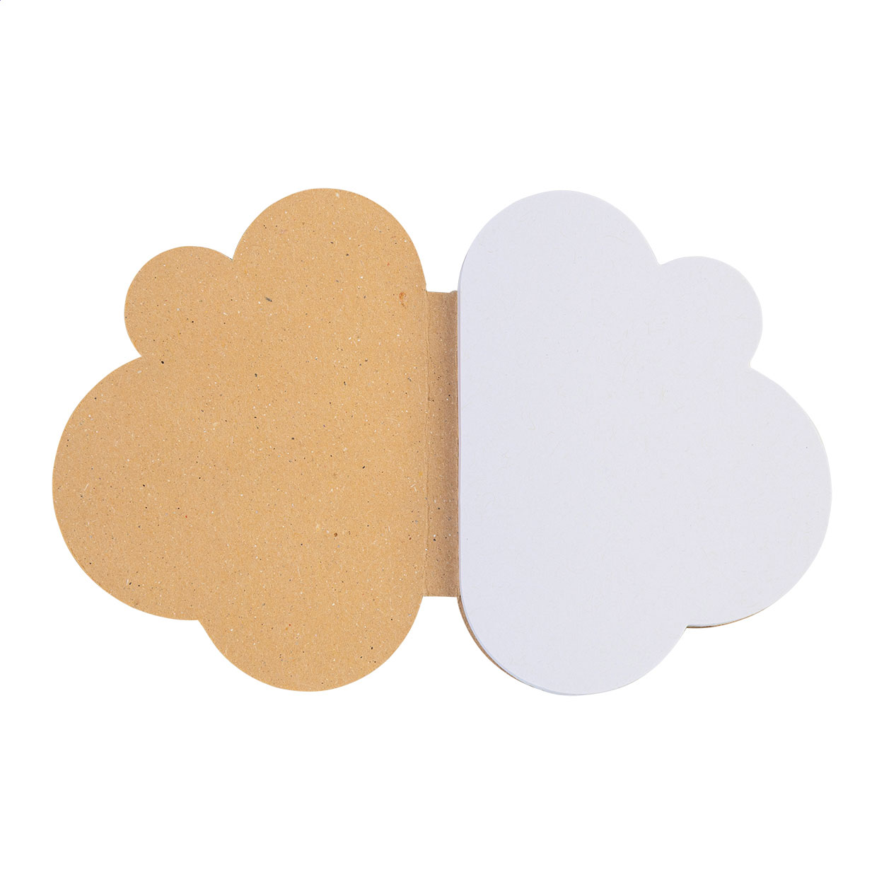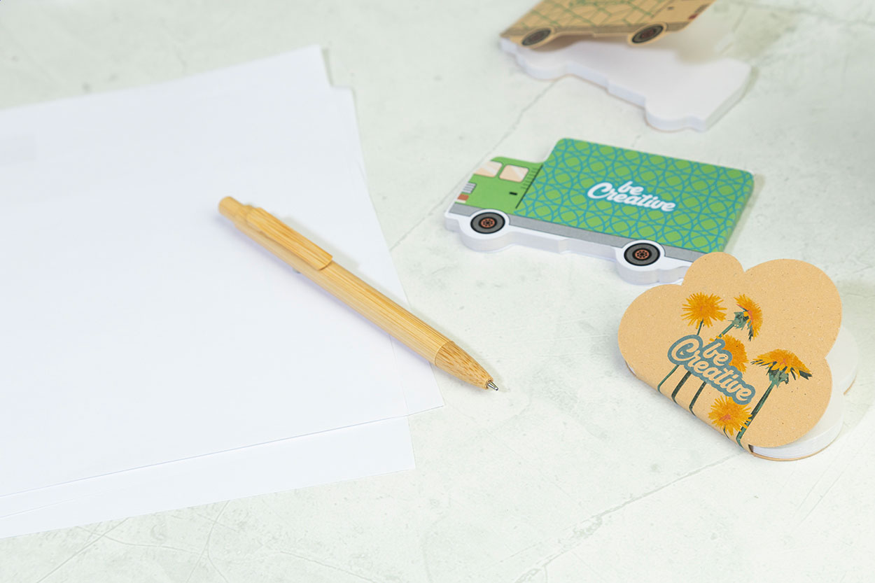 Carnet adeziv, în formă de nor, personalizat, acoperit cu hârtie kraft reciclată. Include 50 de foi de hârtie reciclată adezivă. Prețul include coperta exterioară imprimată full color. Cantitate minimă de comandă: 100 bucăți.