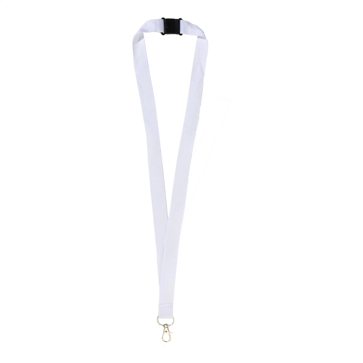 Lanyard din poliester cu carabină metalică și cataramă de siguranță.
