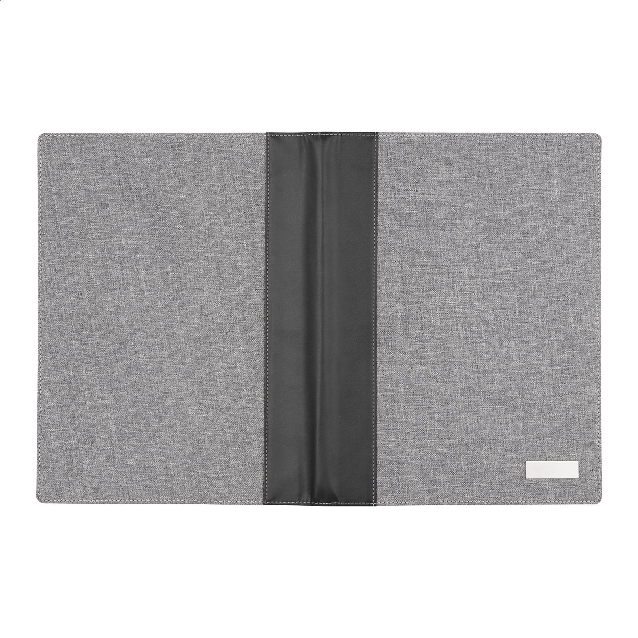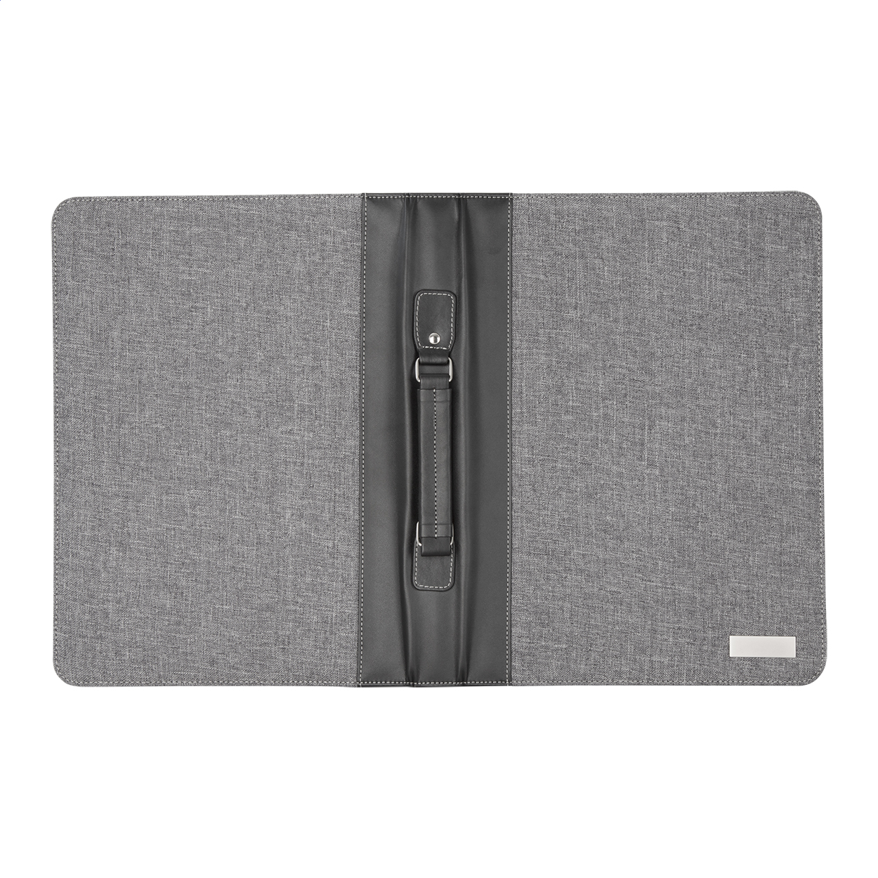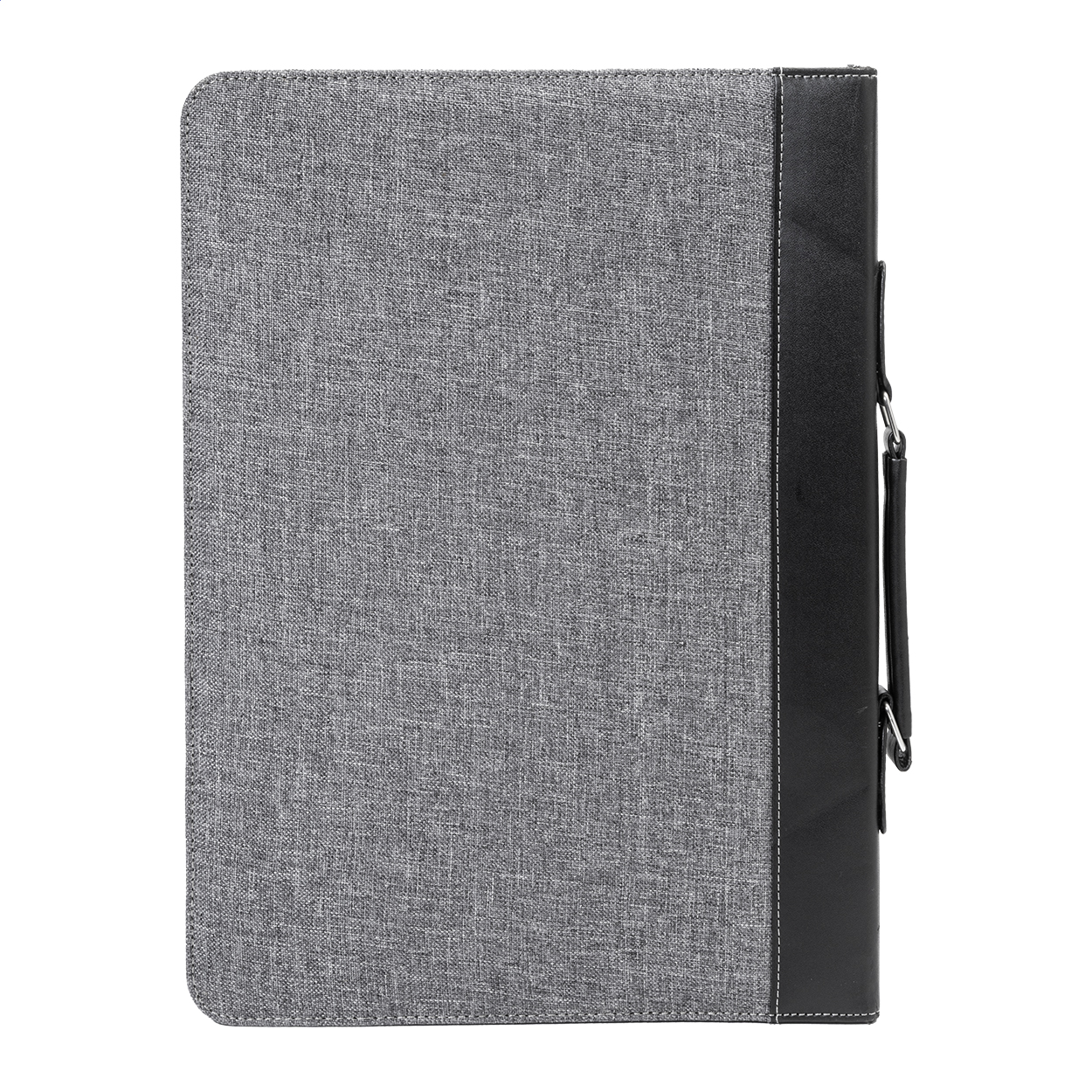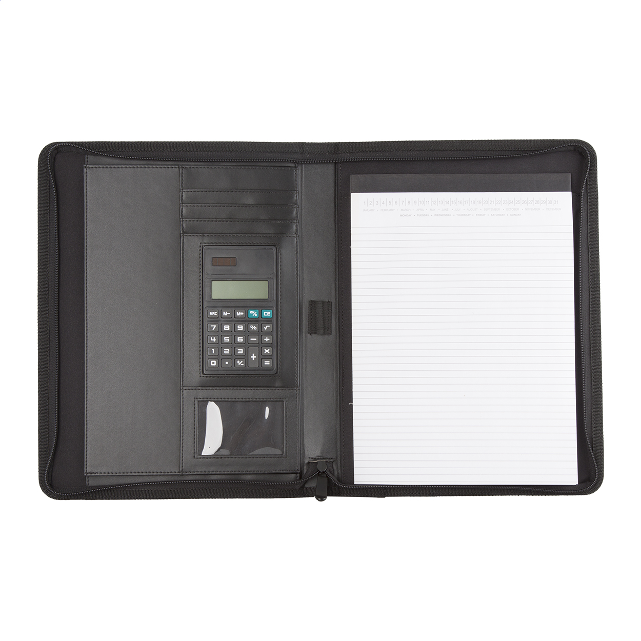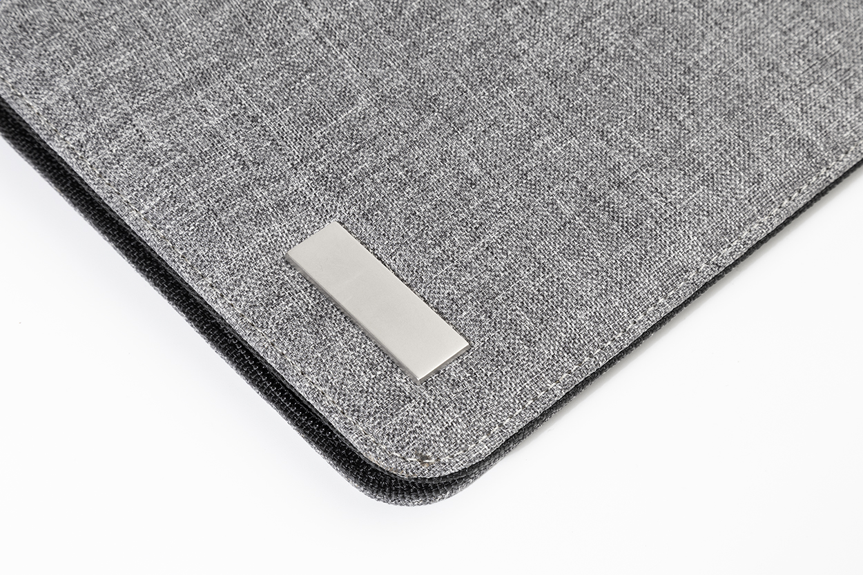 Mapă A4 din pânză și înlocuitor piele, cu fermoar și mâner, blocnotes cu 20 file dictando, calculator cu baterie solară, cu plăcuță metalică.