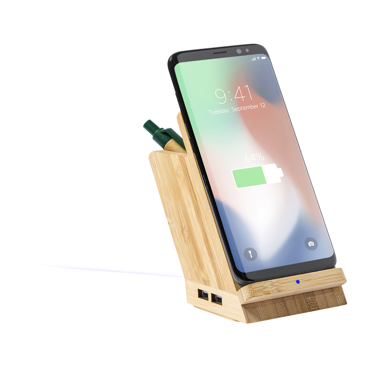 Suport multifuncțional, din bambus, cu suport pentru telefon mobil, încărcător wireless (5W) și hub USB cu 4 porturi (USB 2.0). Inclusiv cablu USB.