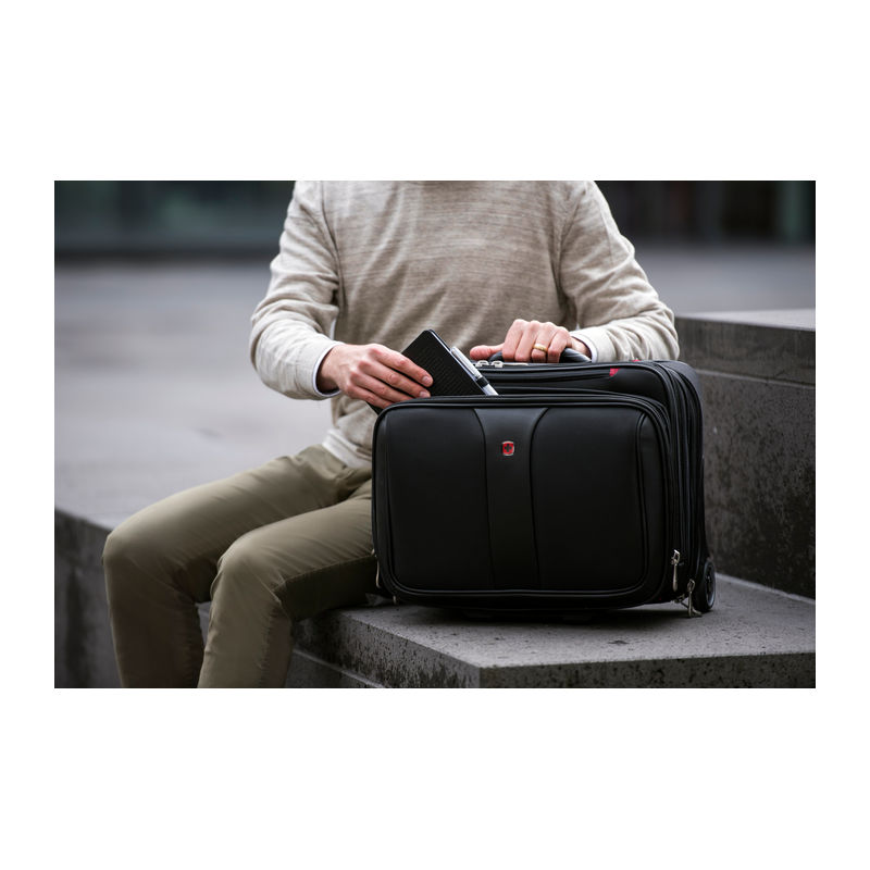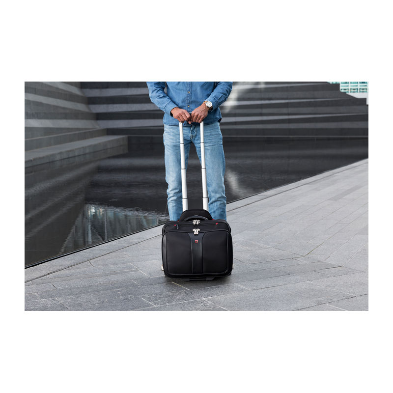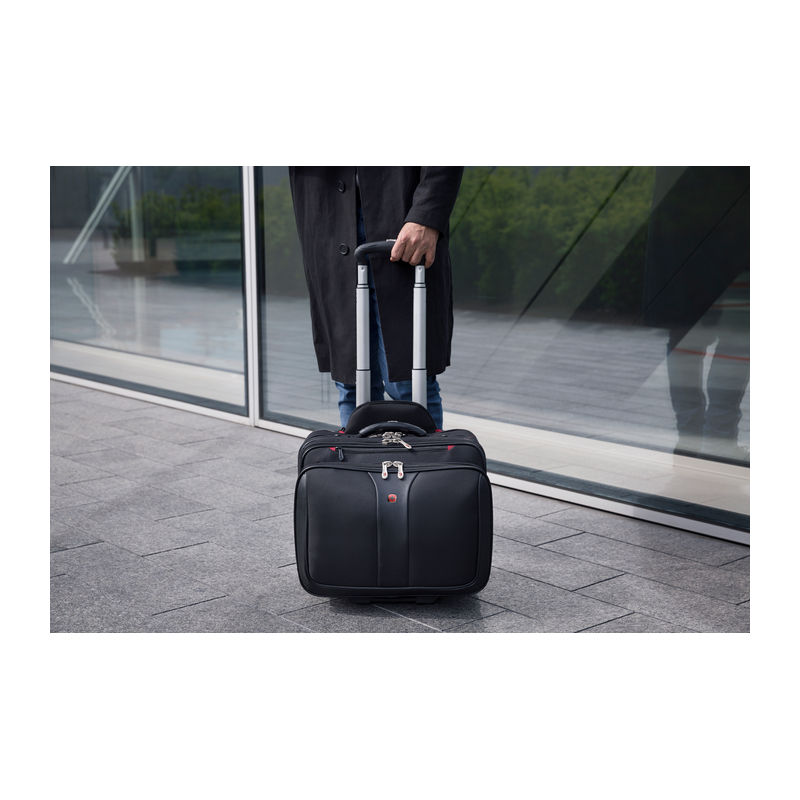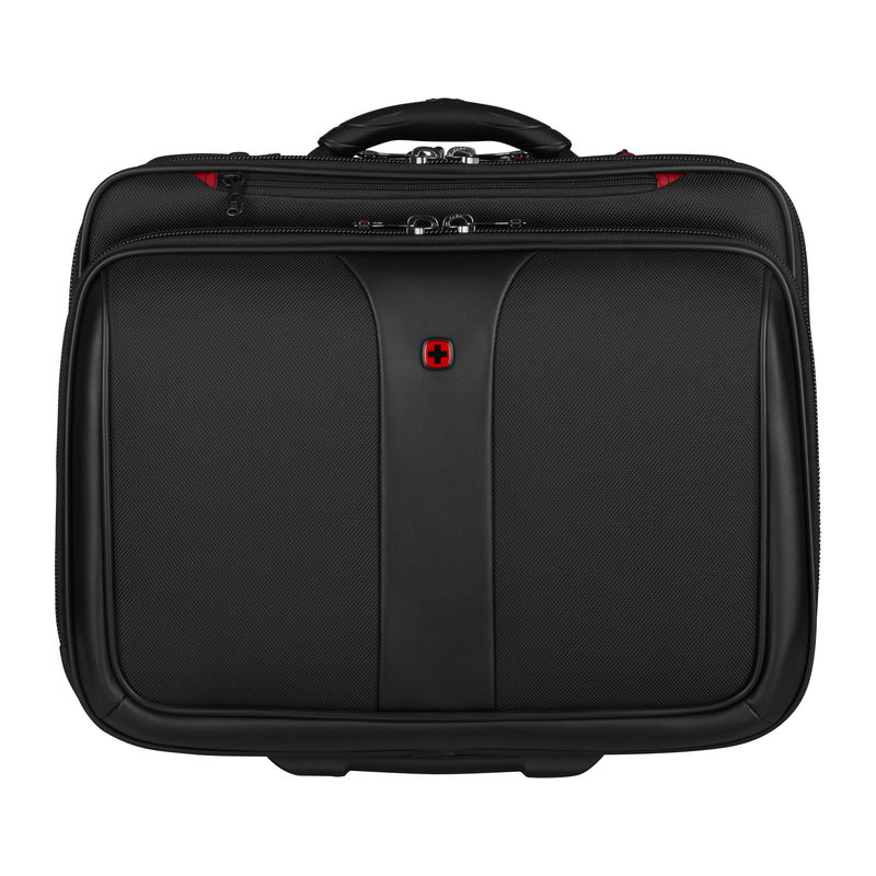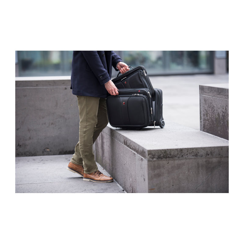 2-piece set consisting of a rolling case and a laptop bag. Computer compartment fits most 15.4/17 carrying handle, trolley strap keeps bag in place on a rolling suitcase. Organizer compartment for pens, business cards, phone and more.