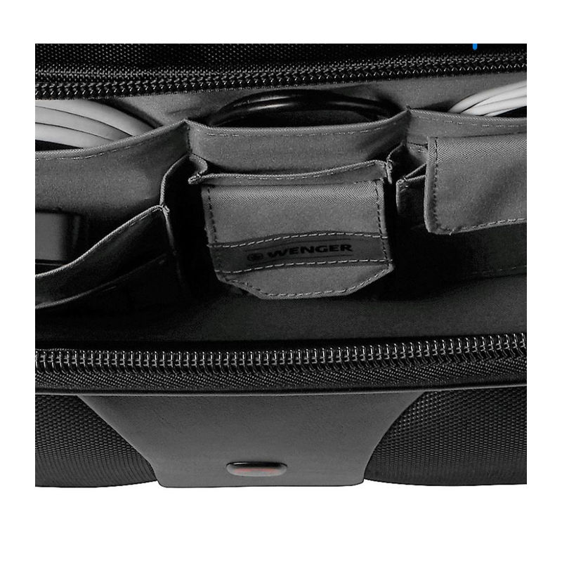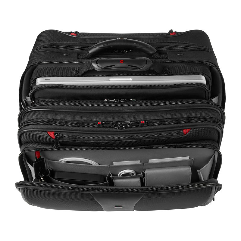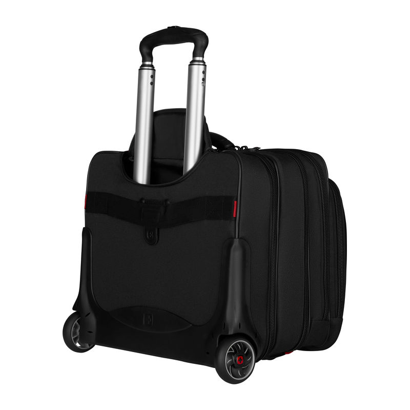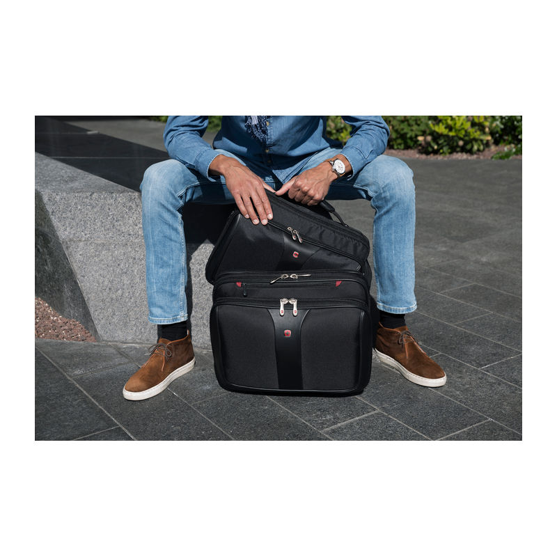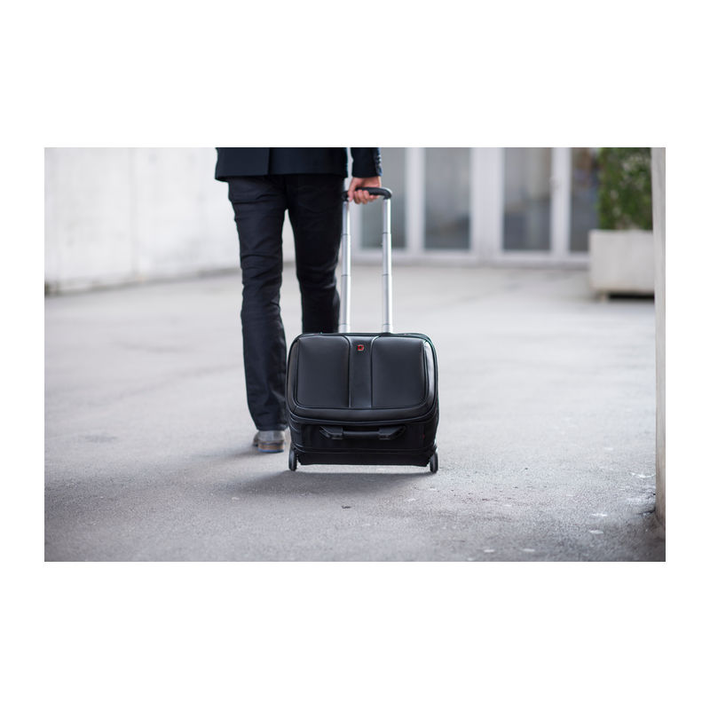 2-piece set consisting of a rolling case and a laptop bag. Computer compartment fits most 15.4/17 carrying handle, trolley strap keeps bag in place on a rolling suitcase. Organizer compartment for pens, business cards, phone and more.