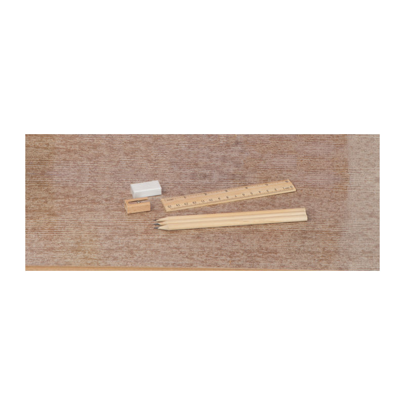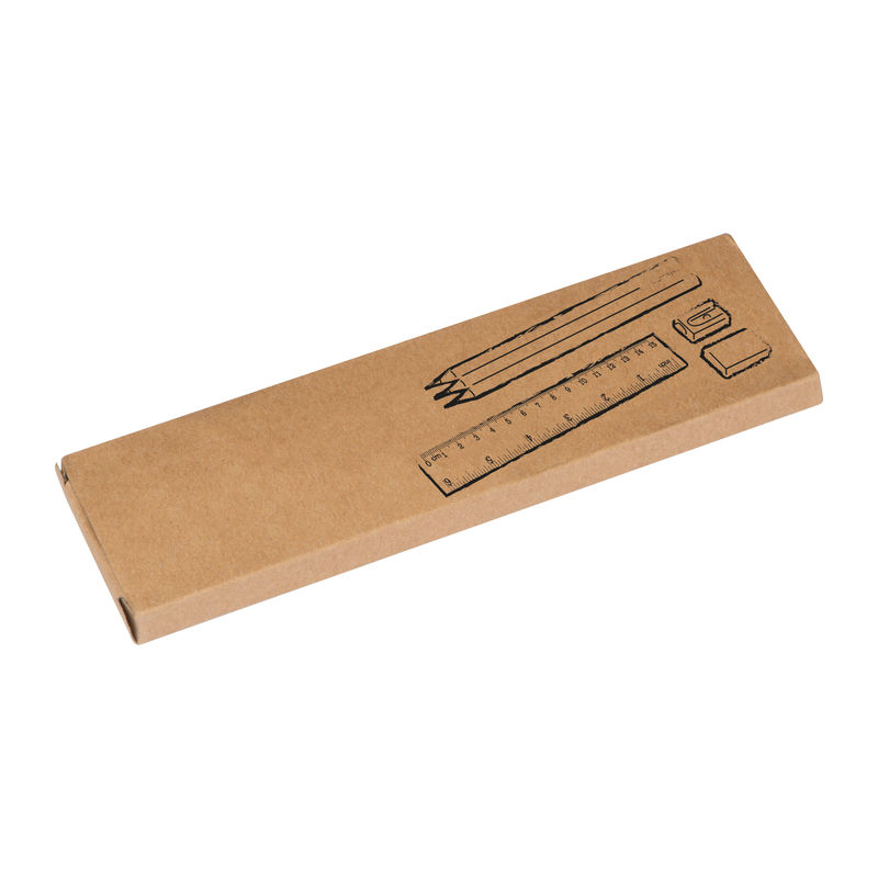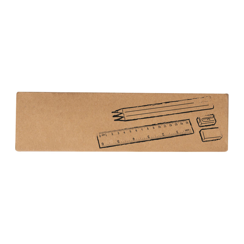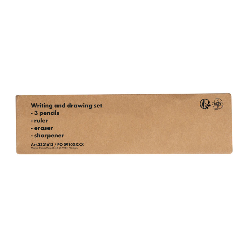 Writing and drawing set comprising three pencils with varying degrees of hardness, a ruler, an eraser, and a sharpener.