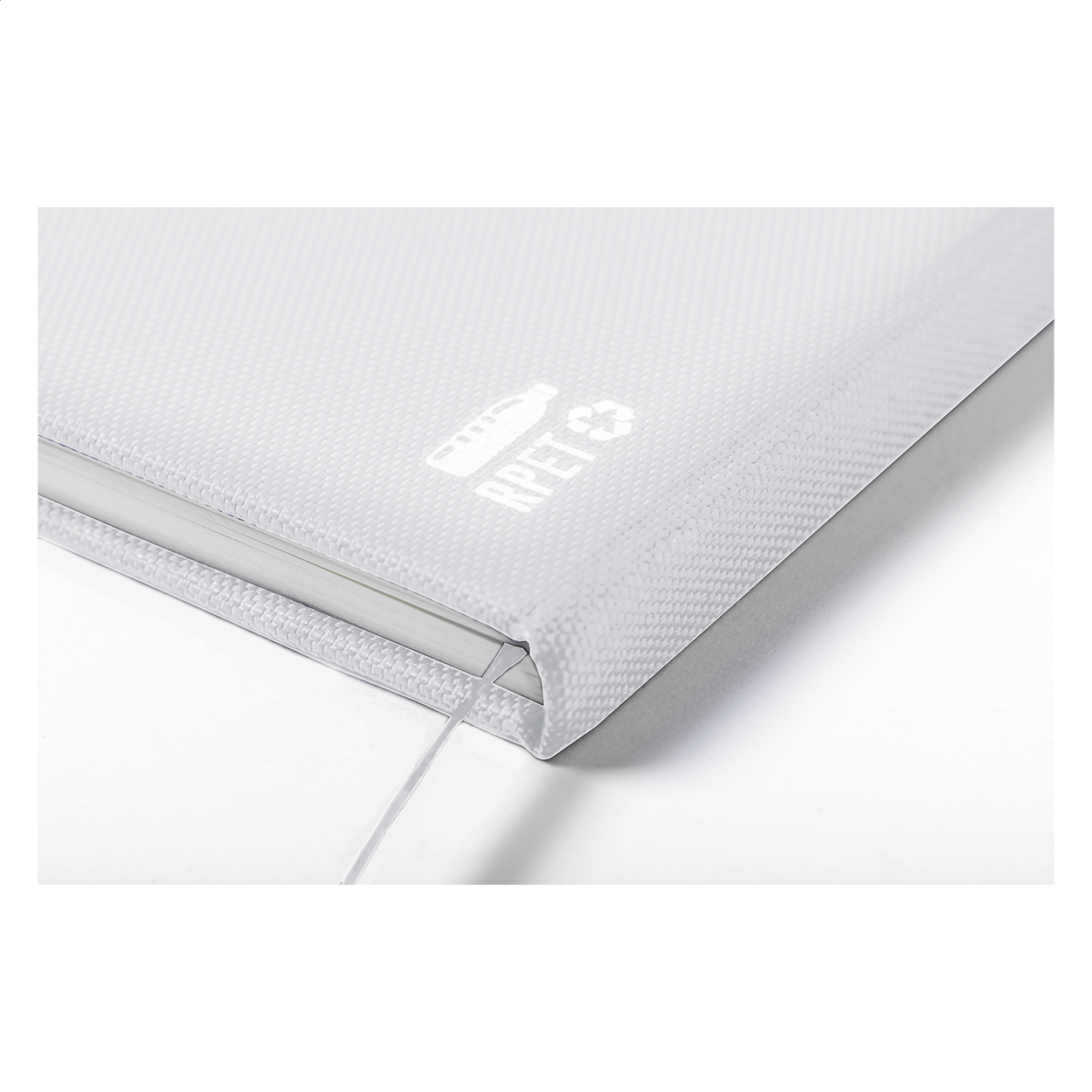 Agendă cu copertă din RPET poliester, cu semn de carte și bandă de cauciuc. Cu 80 de pagini cu liniatură dictando. Dimensiune A5.