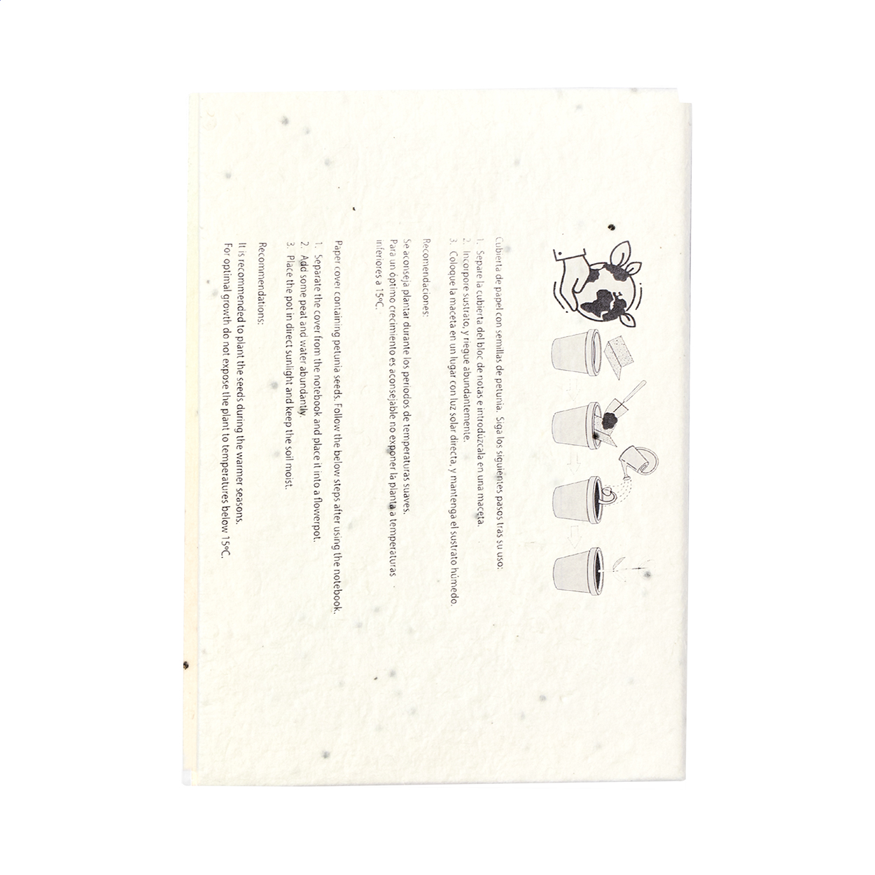 Carnet de note adezive acoperit cu hârtie cu semințe, cu 25 de note și 125 de markere de pagină (în 5 culori diferite). Coperta din hârtie cu semințe conține semințe de petunia în culori asortate, care pot fi plantate prin separarea capacului de blocnotes.