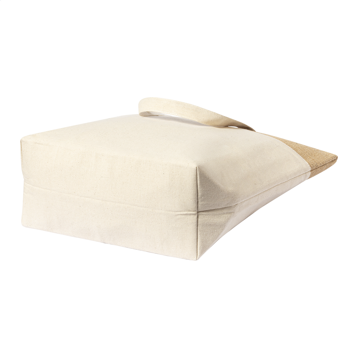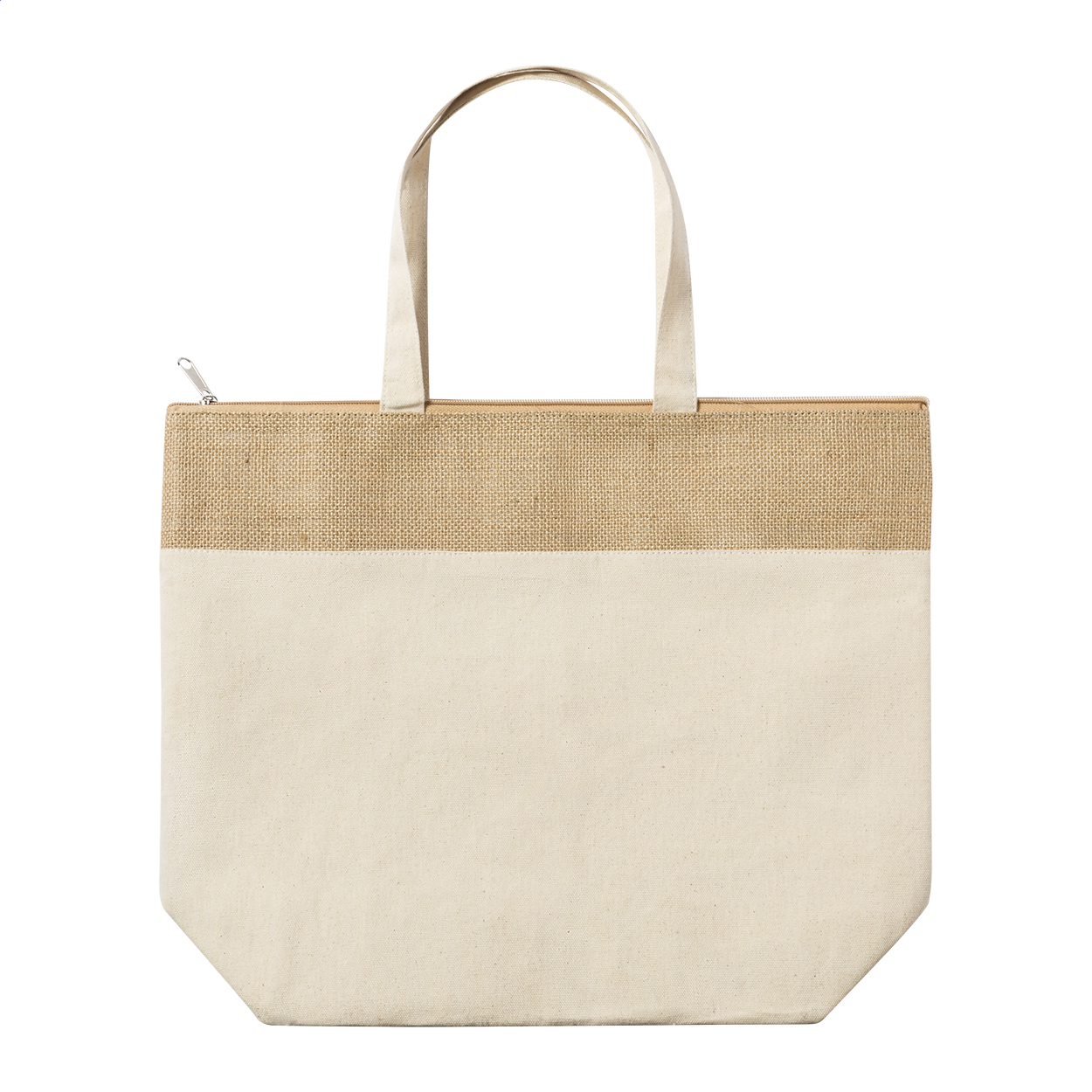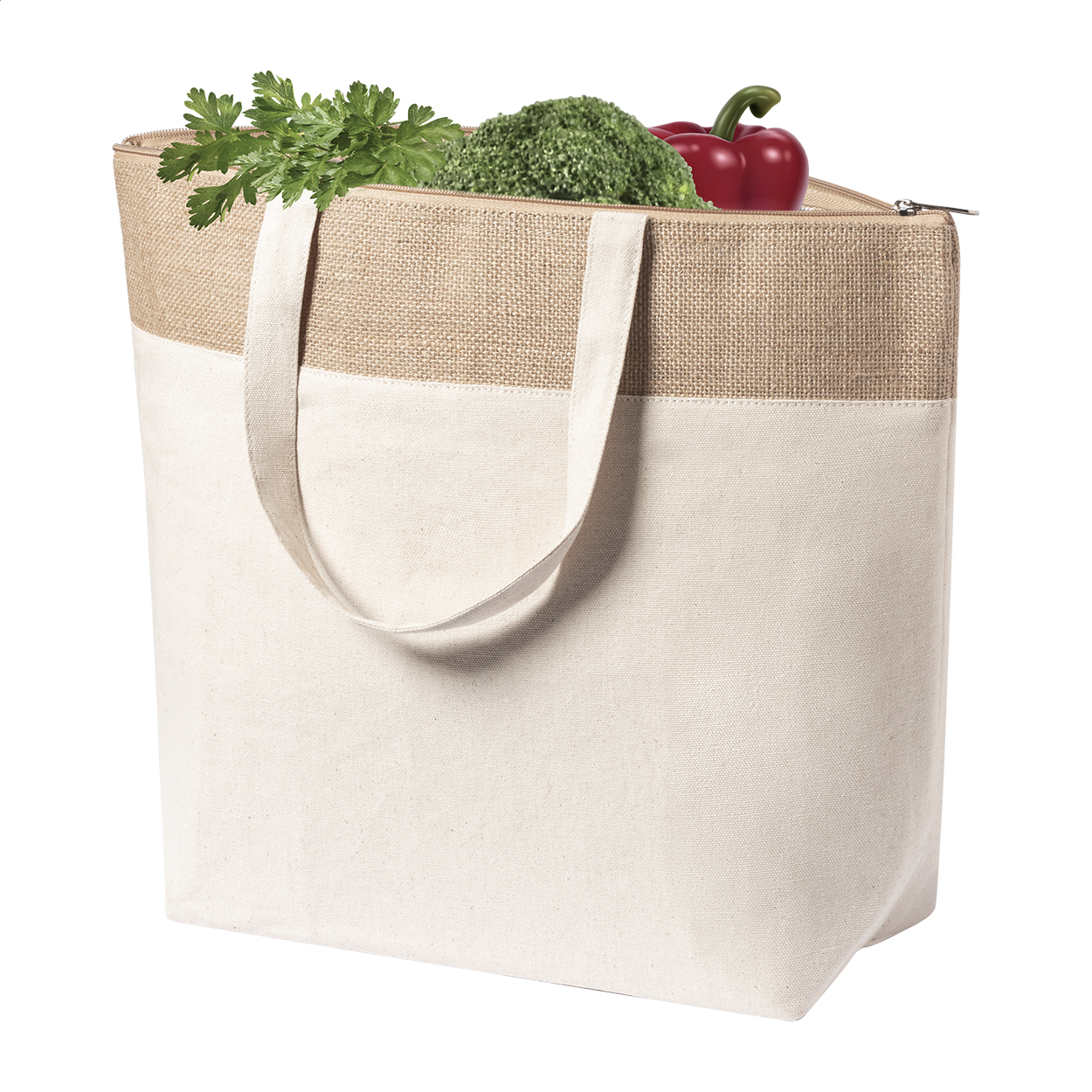 Geantă frigorifică pentru cumpărături 100% bumbac și iută laminată, cu căptușeală din aluminiu și compartiment cu fermoar.