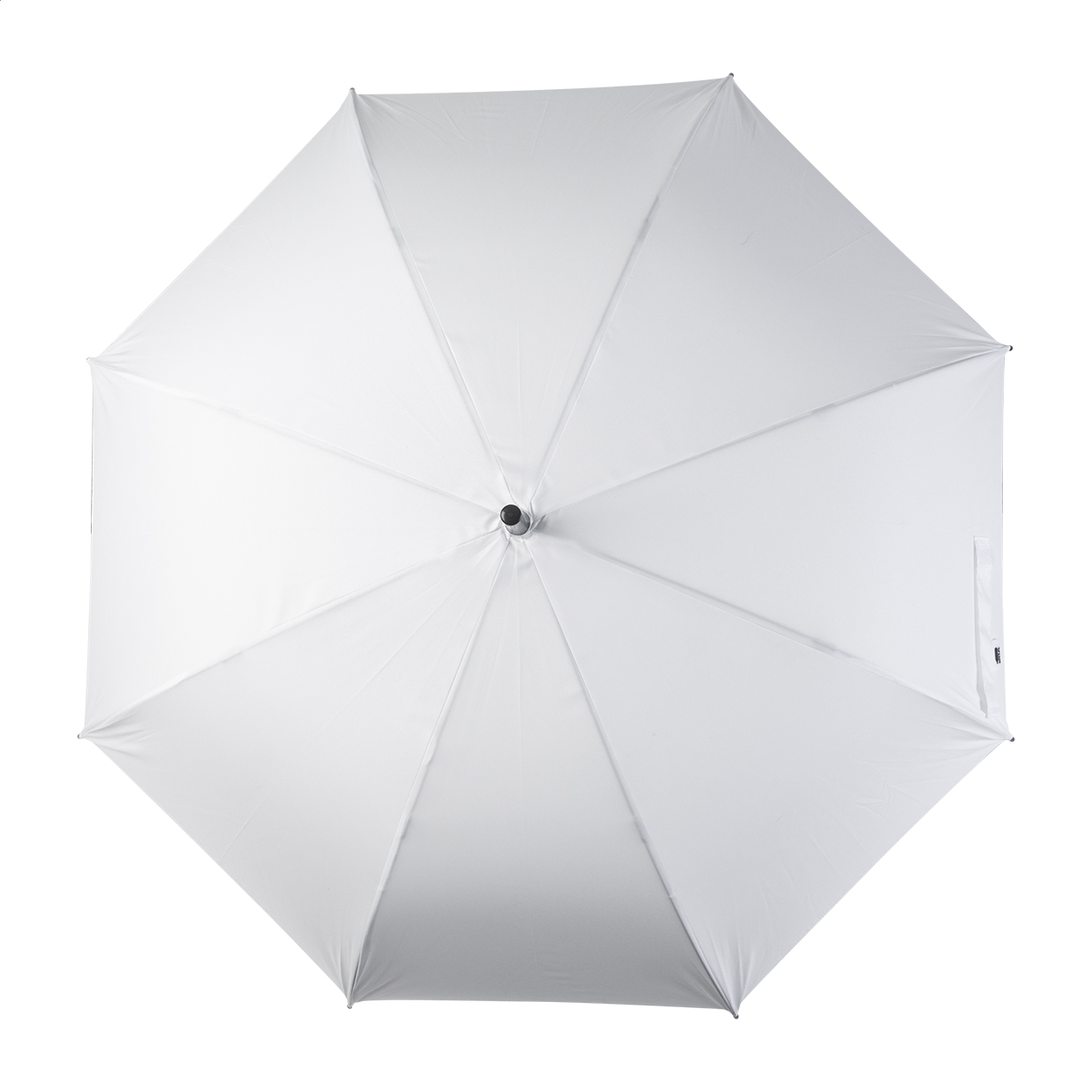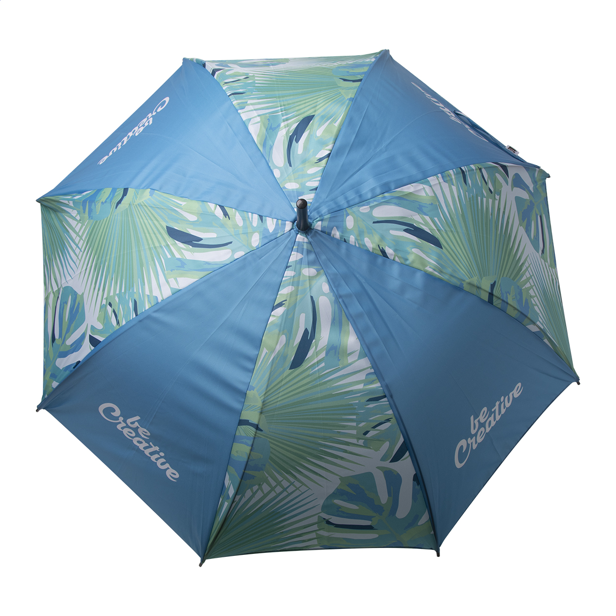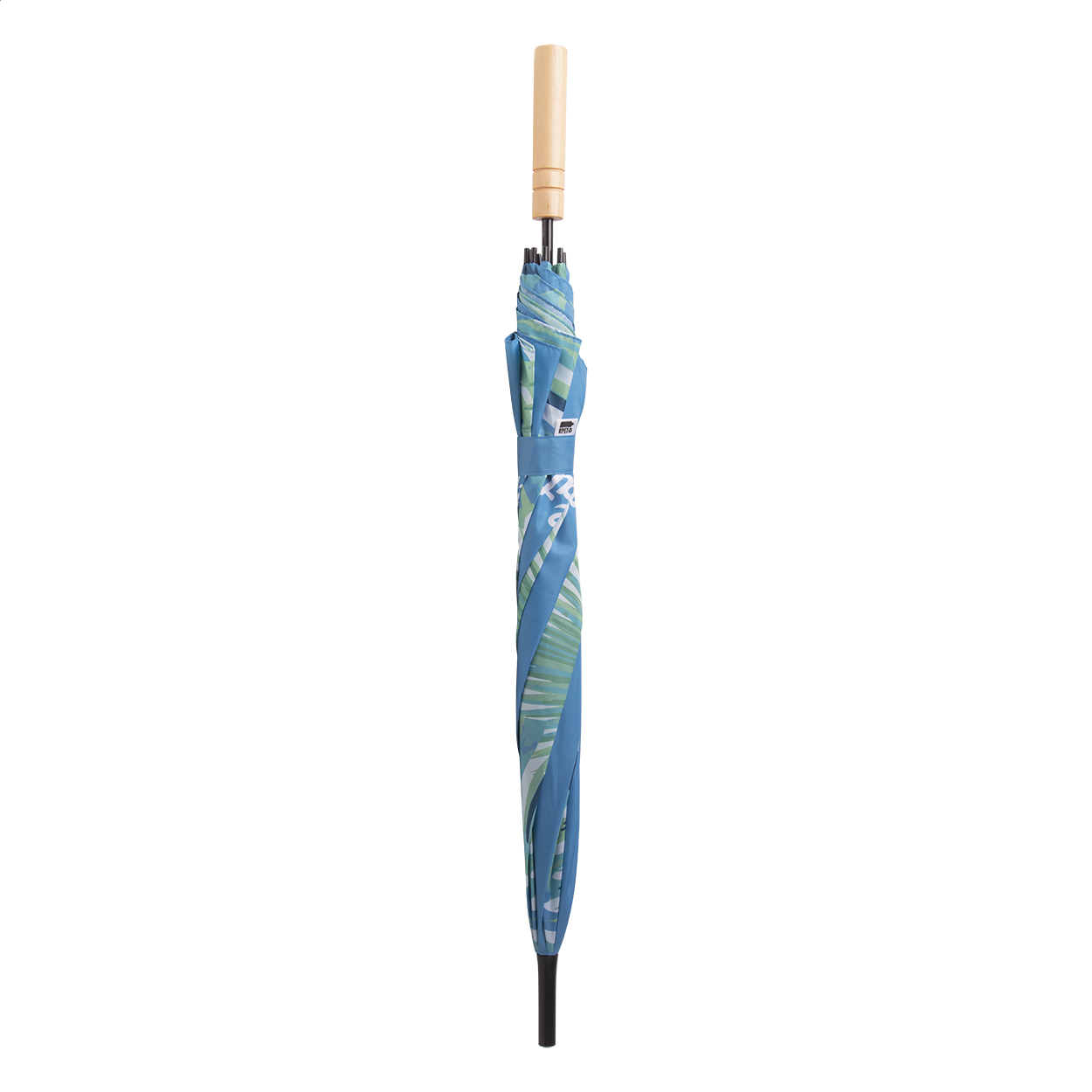 Umbrela automata personalizata, cu 8 panele, cu ax metalic, spite din fibra de sticla si maner din lemn. Pongee RPET 190T. Cu sublimare pe fiecare panel. Cu etichetă distinctă RPET. Cantitate minima de comanda 50 buc.