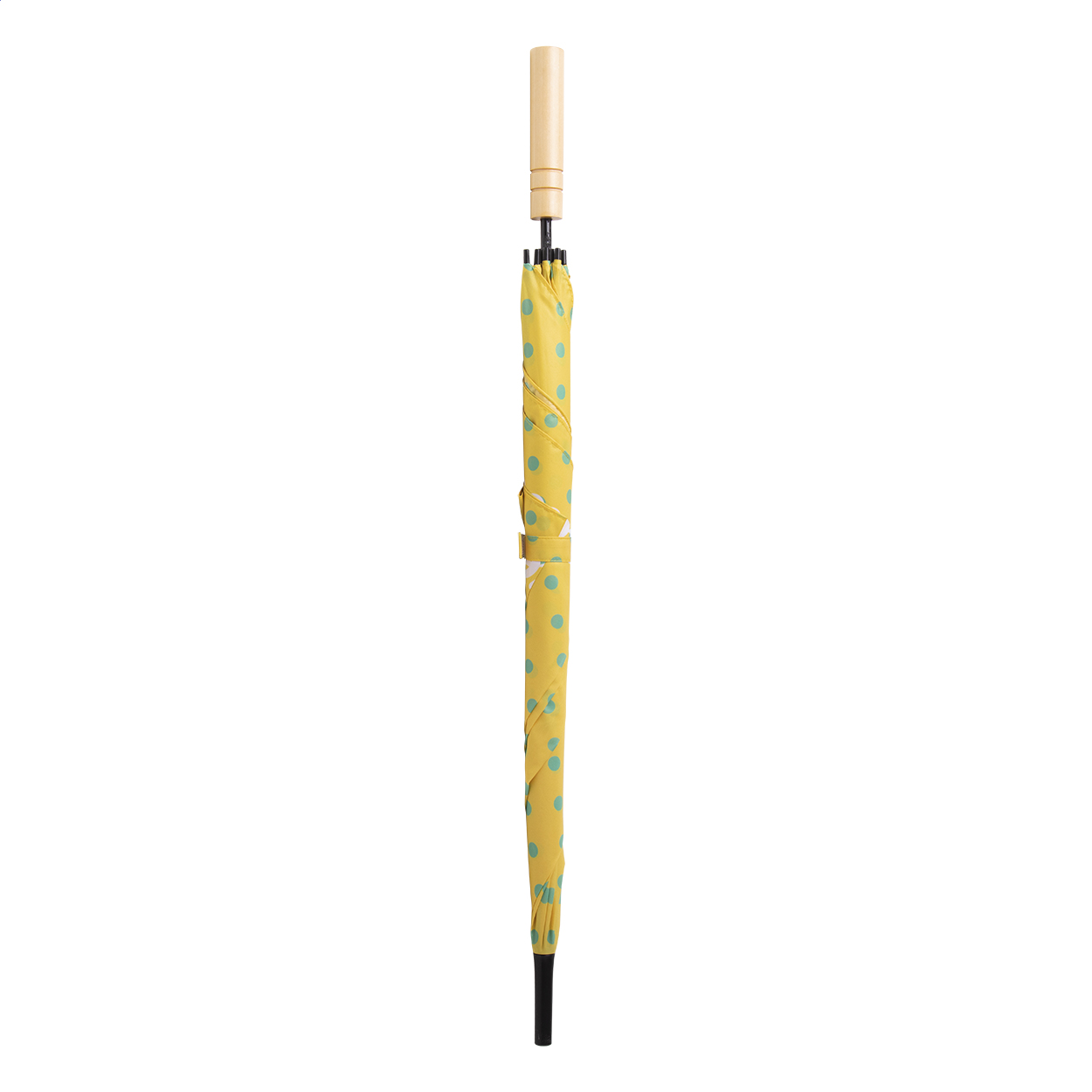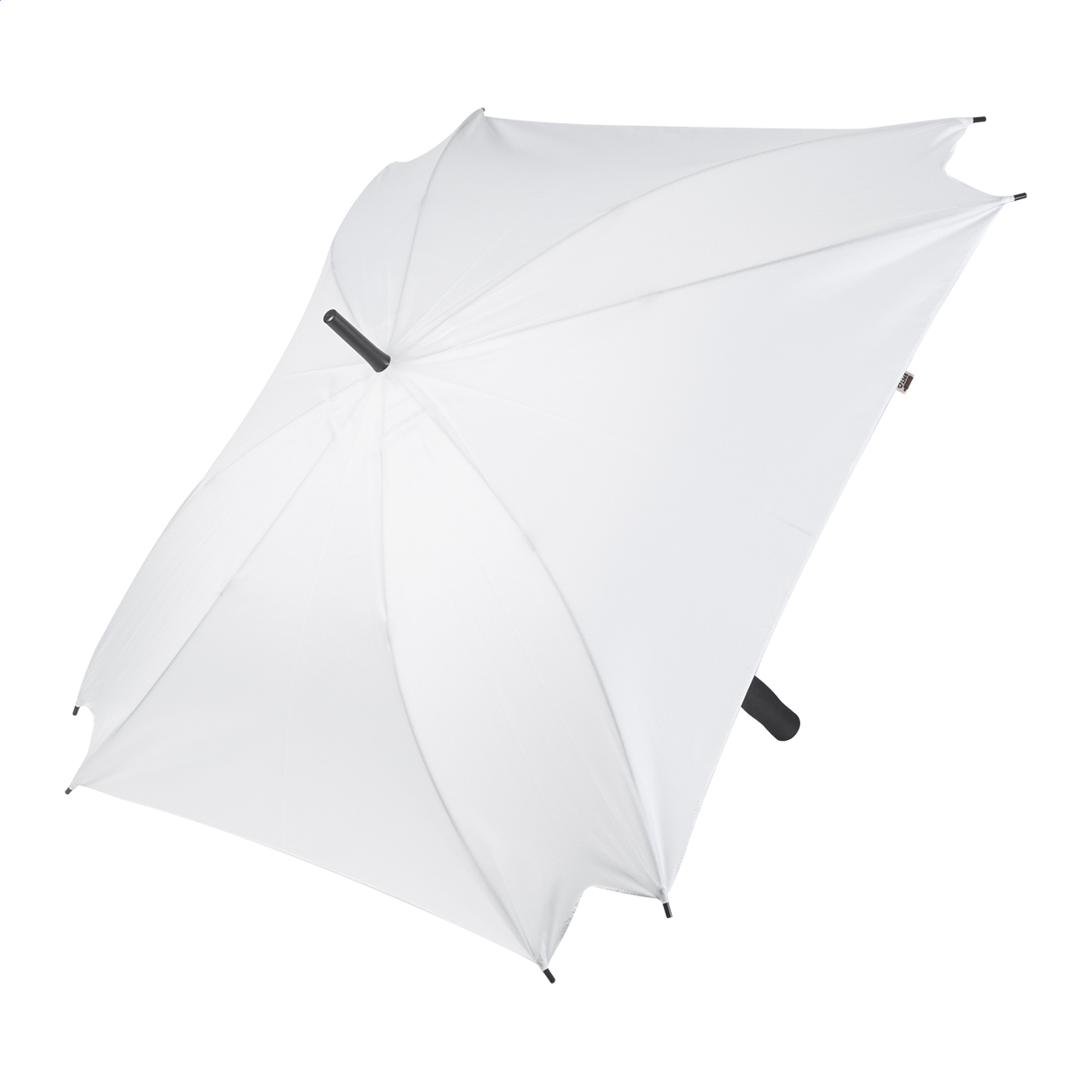Umbrela automata patrata personalizata cu sublimare, cu ax metalic, spite din fibra de sticla si maner din lemn. Pongee 190T RPET. pongee. Cu etichetă distinctă RPET. Cantitate minima de comanda 50 buc.