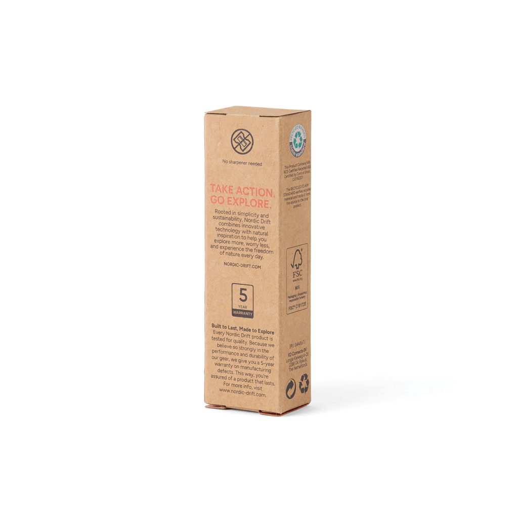 The Nordic Drift Trail Infinity Pocket Pen is designed for outdoor use and everyday adventures. The graphite tip slides out with the orange button for writing and retracts into the body to keep the tip protected. A webbing loop at the top allows the pen to be attached to a backpack so it is always within reach. Unlike traditional wooden pencils that write up to around 200 metres, the graphite tip of this infinity pencil can write up to approximately 20,000 metres. It writes like a regular pencil and the graphite markings can be erased while the tip wears down slowly. The pen is made with RCS certified recycled ABS. A small compass on the top provides a simple indication of direction. The item is packed in FSC® certified packaging without plastic. All Nordic Drift products are tested for quality. Because we strongly believe in the performance and durability of our gear, every item is backed by a 5-year warranty on manufacturing defects.