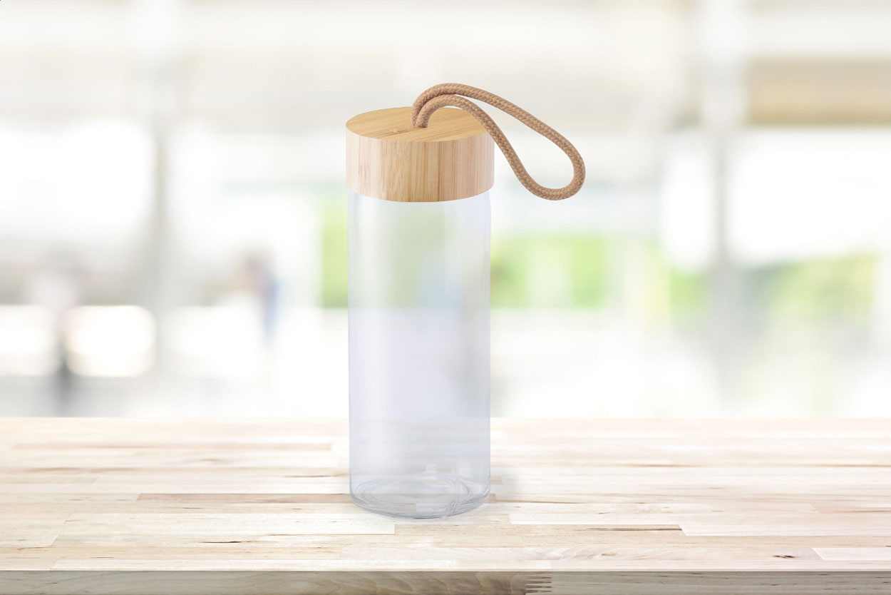 Sticlă din sticlă, cu capac din bambus, 430 ml. În cutie cadou. Nu este potrivit pentru băuturi carbogazoase.