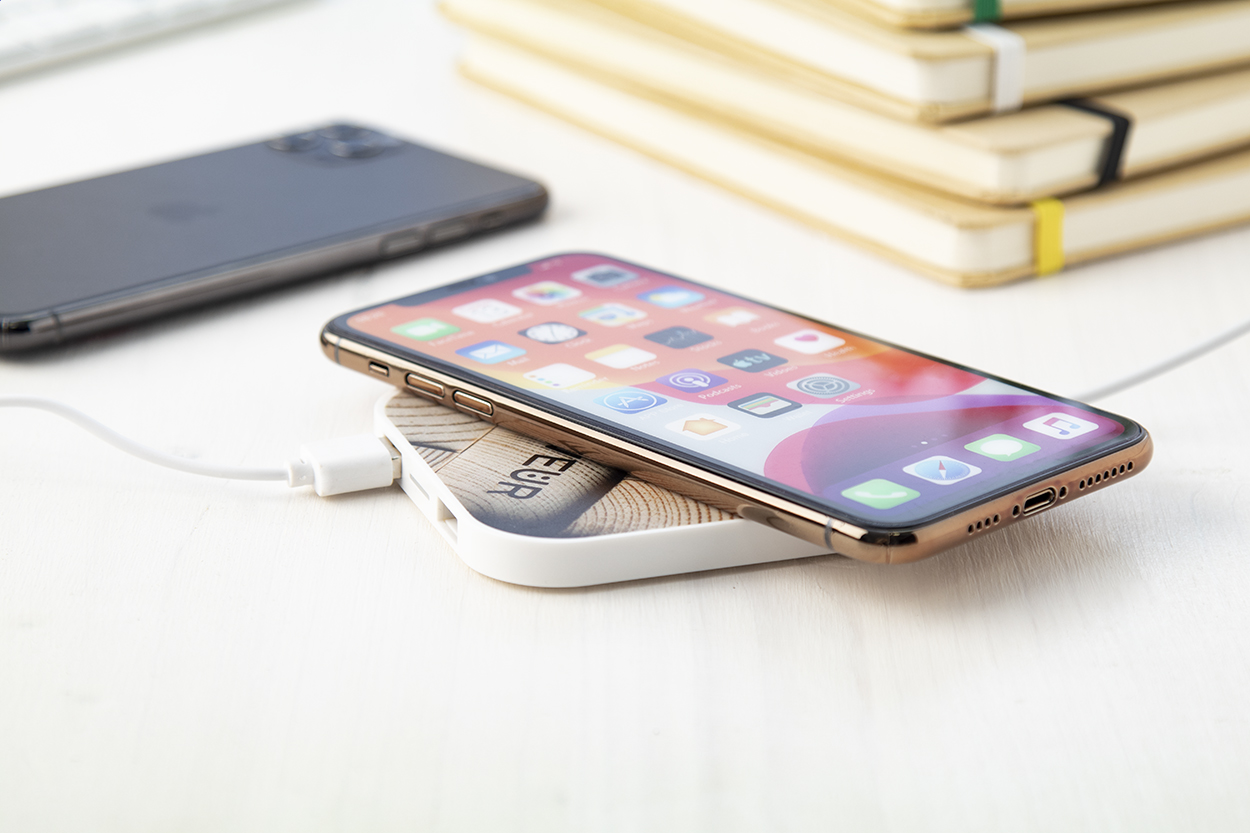 Încărcător wireless din plastic (10W) cu 2 porturi USB pentru încărcător. Ieșire maximă 2100 mA. Inclusiv cablu de încărcare USB.