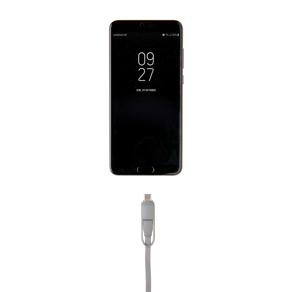 Compact and retractable 3 in 1 charging cable with type C and double-sided connector for IOS and Android devices that require micro usb. Because of the retractable mechanism the 100 cm long flat cable can easily be taken anywhere without it getting tangled. ABS case with TPU material cable. Also suitable for syncing.
