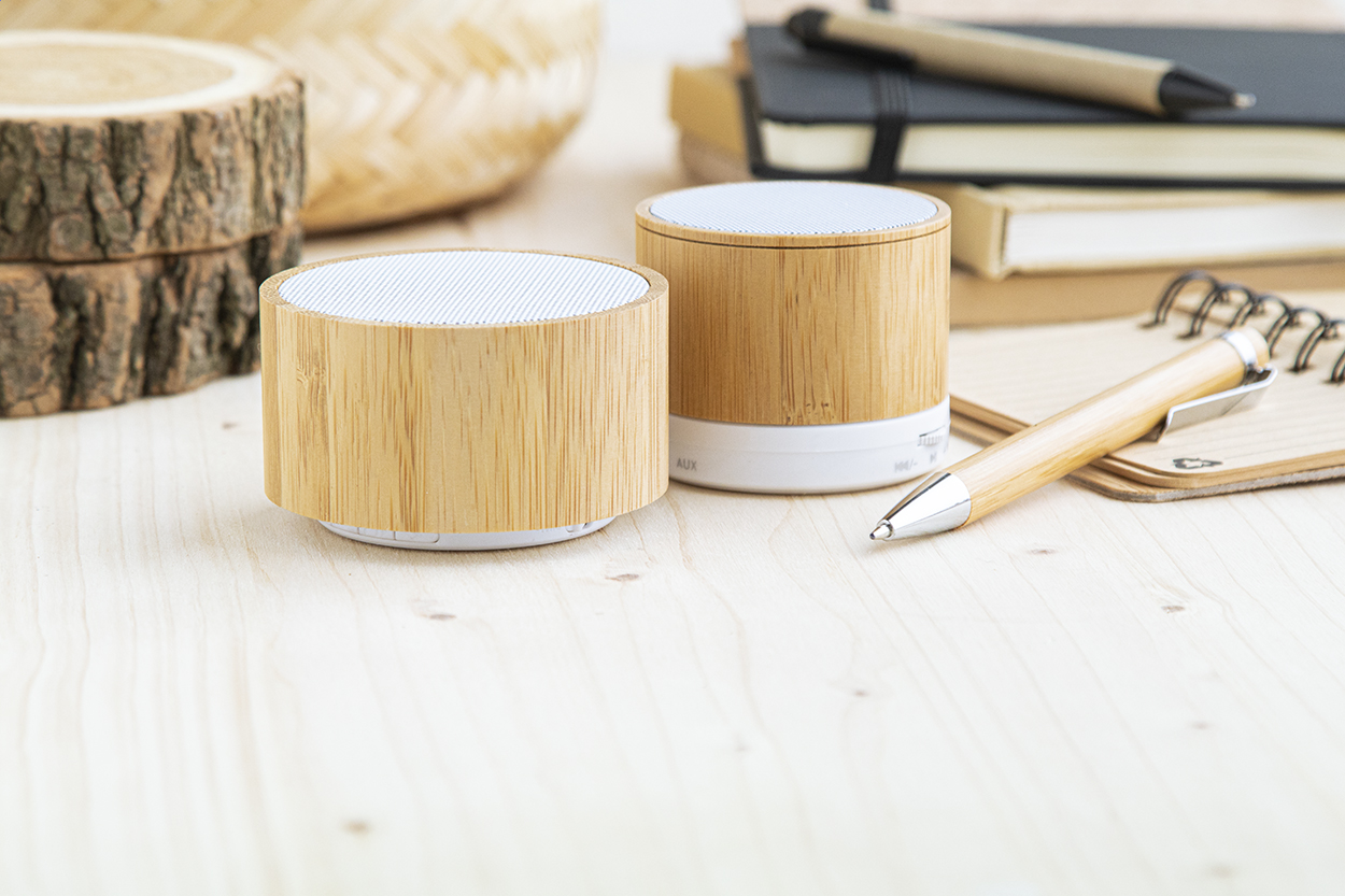 Difuzor wireless în carcasă de bambus cu funcție de apelare mâini libere, radio FM și baterie reîncărcabilă încorporată. Inclusiv cablu de încărcare USB.