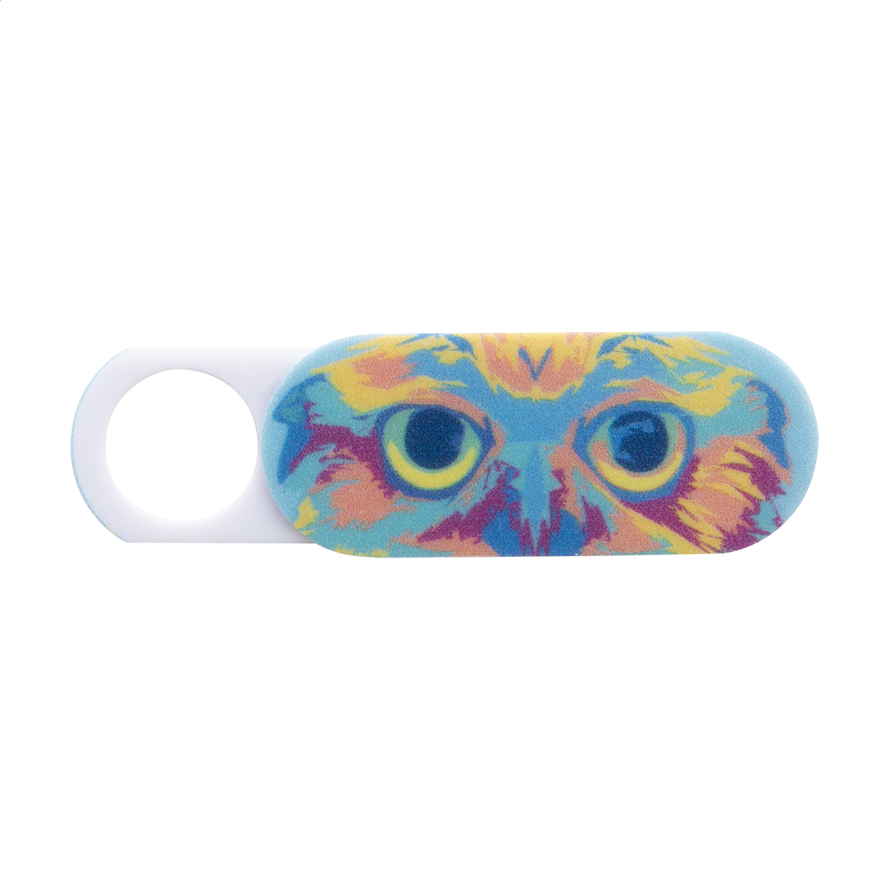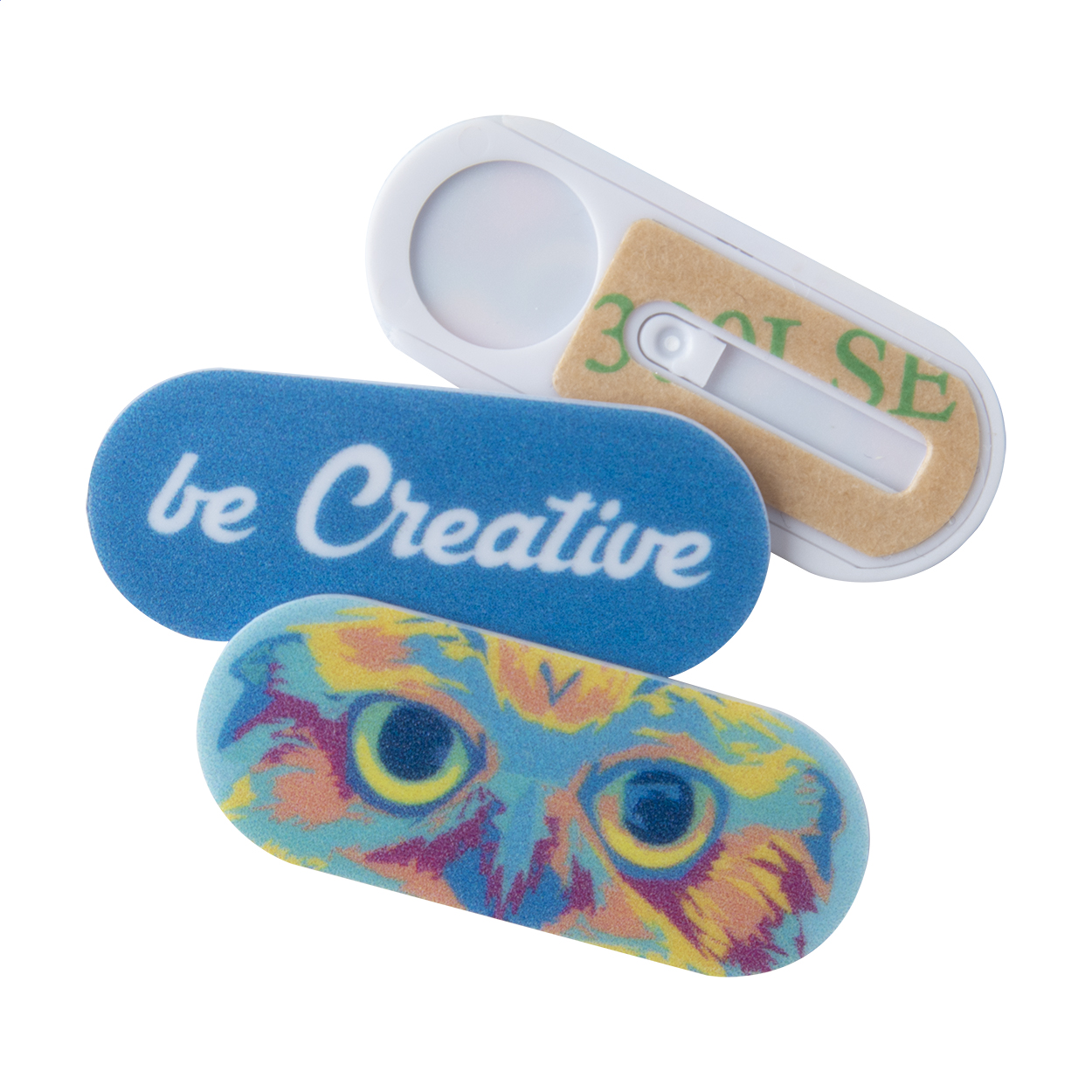 Blocker culisant din plastic pentru cameră web, anti-spion, personalizat full colour, cu adeziv. Cu cartonaș imprimat digital. Prețul include imprimarea digitală și UV LED. Cantitate minimă de comandă: 100 buc.