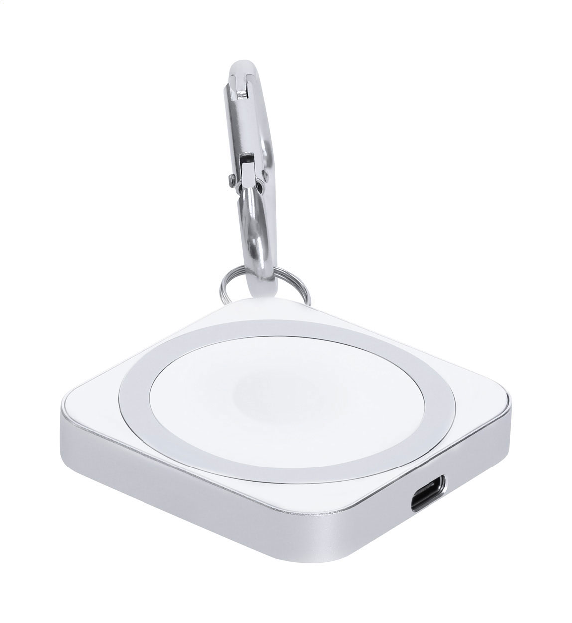 Încărcător rapid fără fir, magnetic (15W), în carcasă din aluminiu cu carabină. Proiectat pentru încărcarea smartphone-urilor, a căștilor și a ceasurilor inteligente. Compatibil cu iPhone® 12 sau mai nou.