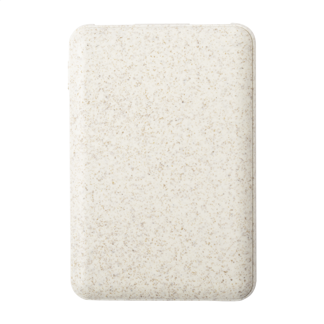 Power bank din plastic ecologic din fibre de paie de grău. Baterie 5000 mAh și 2 iesiri USB. Se livrează cu cablu de încărcare micro USB.