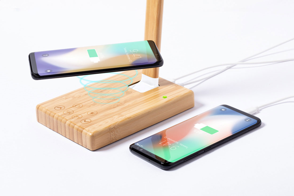 Lampă de birou multifuncțională, din bambus, cu 25 LED-uri, luminozitate reglabilă și temporizator de 1/2 oră. Cu încărcător rapid fără fir (10W) și port USB pentru încărcarea a 2 dispozitive simultan (1 fără fir și 1 prin cablu). Inclusiv cablu de încărcare USB.