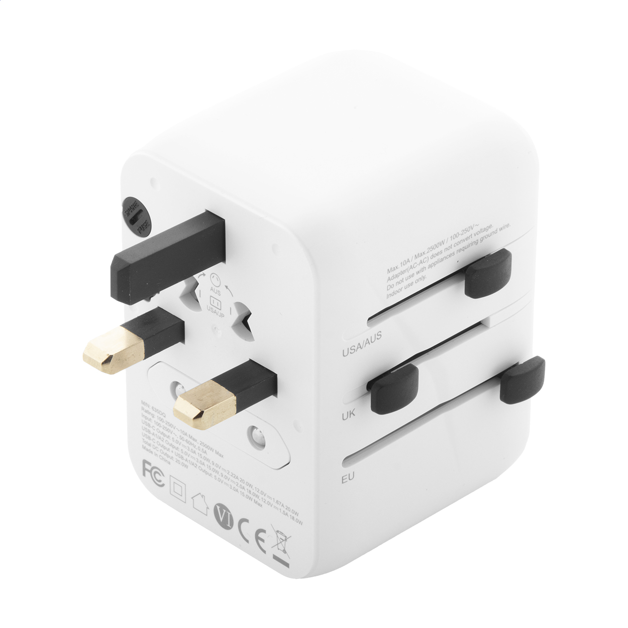 Adaptor universal de călătorie, la nivel mondial, din plastic ABS, cu prize de perete încorporate pentru SUA, Europa, Marea Britanie și Australia. Cu 2 porturi USB și 1 USB-C pentru încărcător rapid. Suportă tehnologia de încărcare rapidă (PD20W).