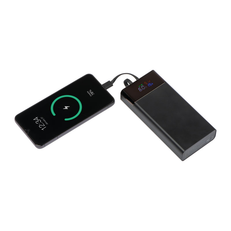 The ultimate mobile power solution with our power bank, offering an impressive capacity of 20,000 mAh. This powerful power bank is equipped with a fast-charging function, ensuring your devices are ready to use in no time. With two USB ports, a USB-C port, and an integrated iOS cable, it provides versatile charging options for all your devices. The smart LCD display shows the current charging status and other important information at a glance. This power bank is the ideal promotional gift or practical accessory for everyday use, impressing with its functionality and high-quality craftsmanship.