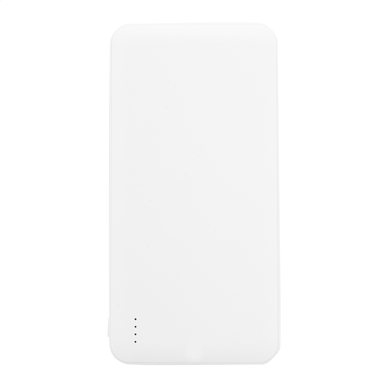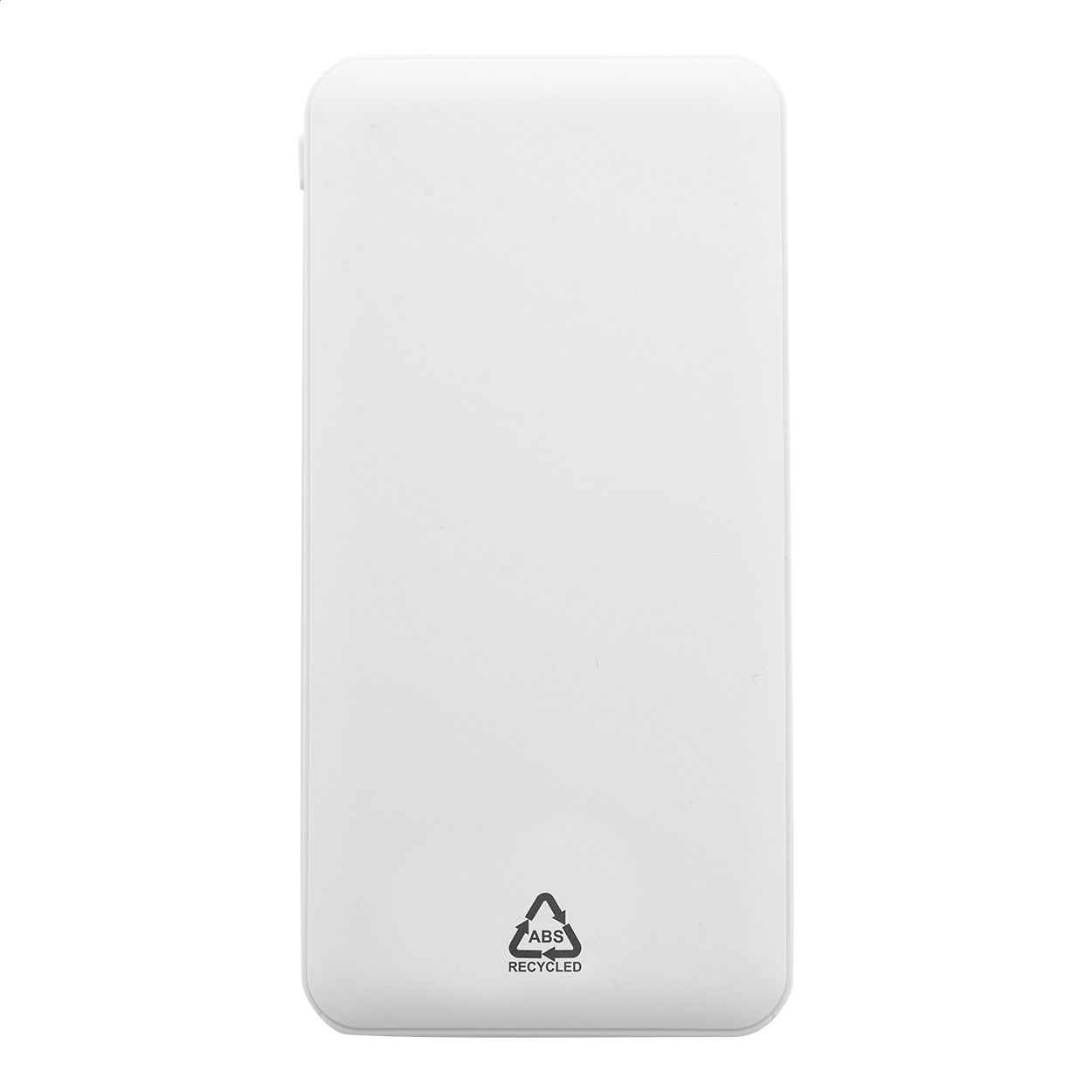 Baterie externă din plastic ABS reciclat, cu baterie de 10000 mAh. Cu 2 porturi USB și 1 USB-C pentru încărcător. Porturi de intrare micro USB și USB-C. Inclusiv cablu de încărcare USB.