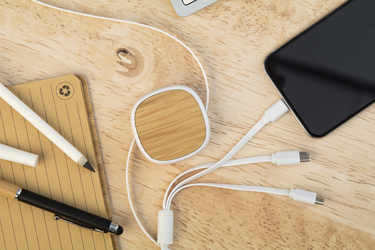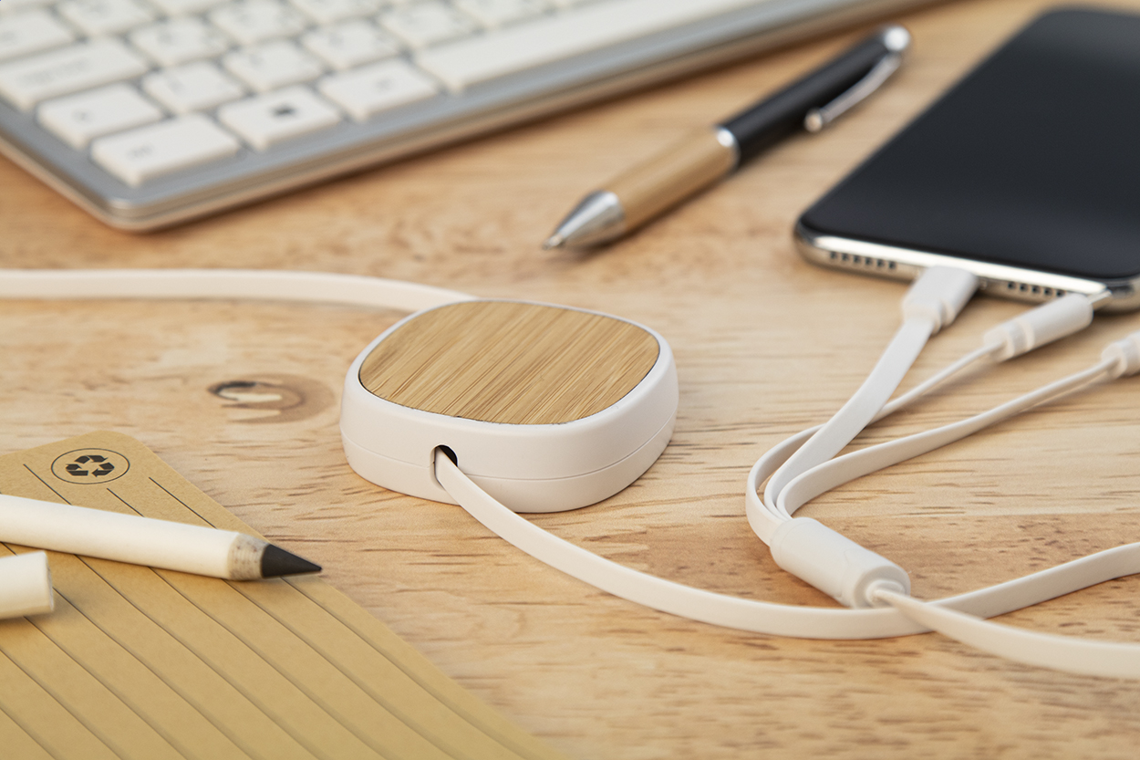 Cablu de încărcare USB telescopic din ABS reciclat și bambus. Cu conectori micro USB, USB-C și Lightning. Cu intrări USB și USB-C.