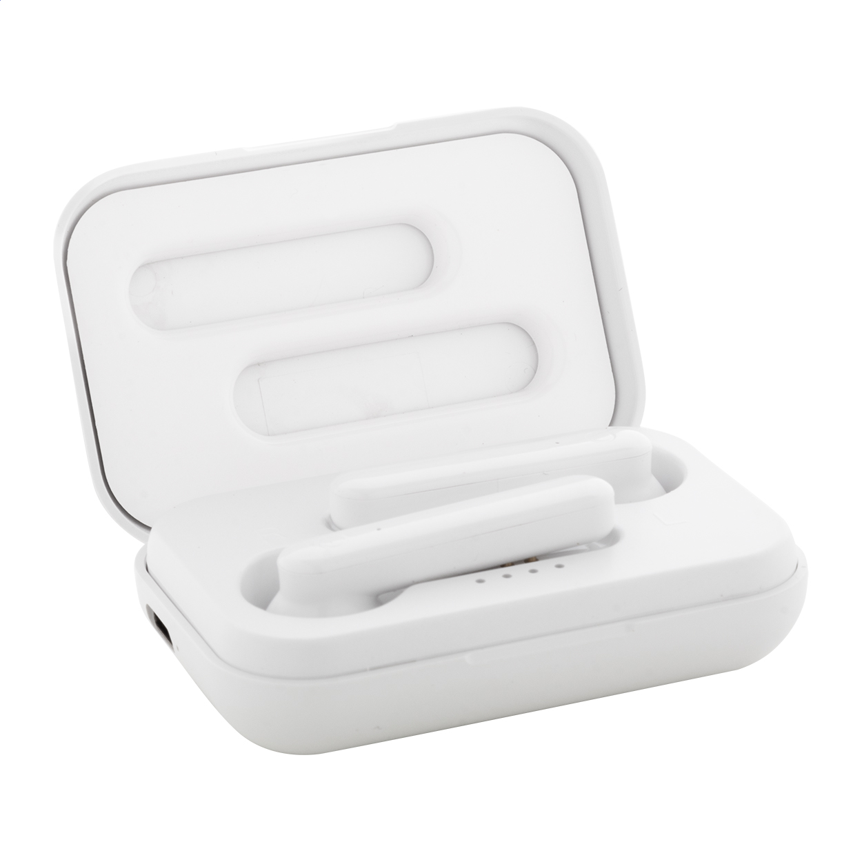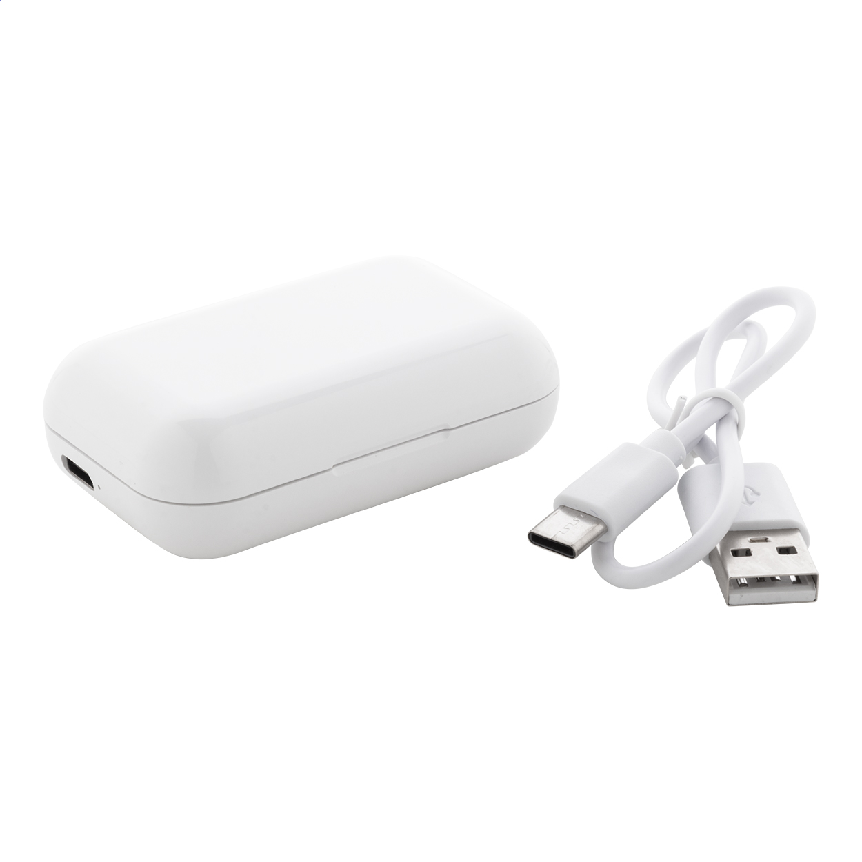 Căști adevărate stereo fără fir (TWS) din plastic ABS reciclat cu funcție de apelare mâini libere, în carcasă de plastic pentru încărcător cu baterie de 400 mAh. Inclusiv cablu de încărcare USB.