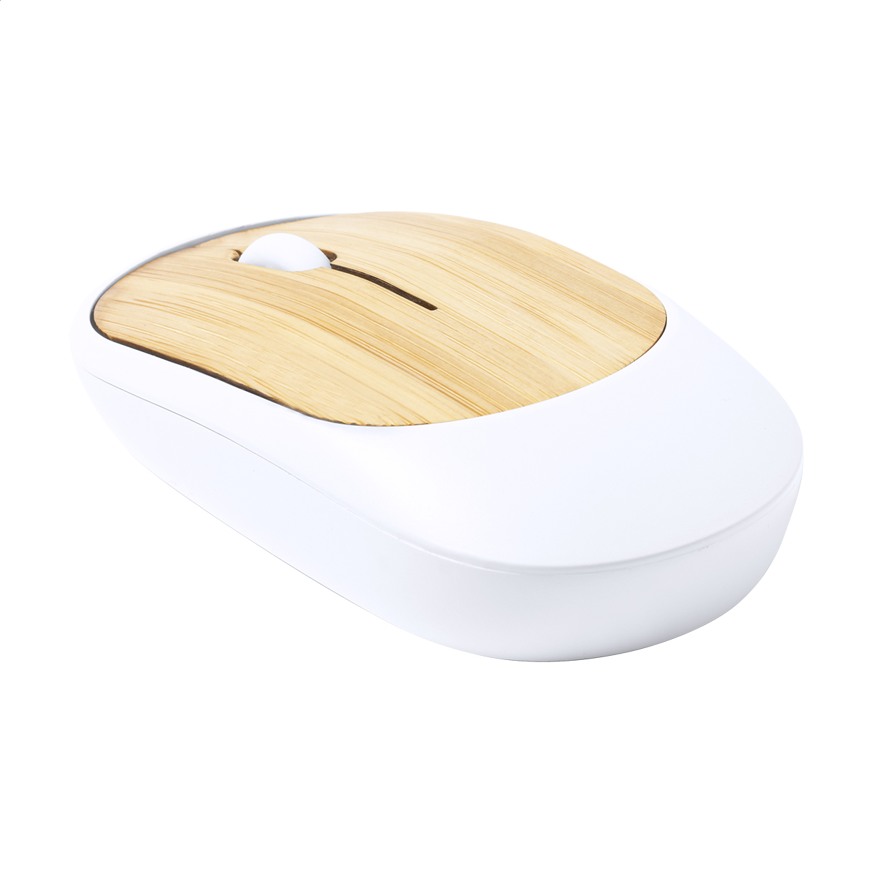 Mouse optic, fără fir, cu carcasă din bambus și ABS. Funcționează cu 1 baterie AA, se livrează fără baterie.
