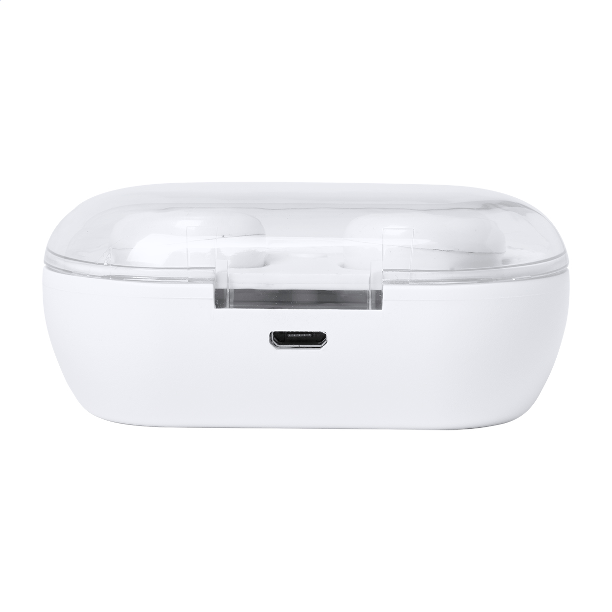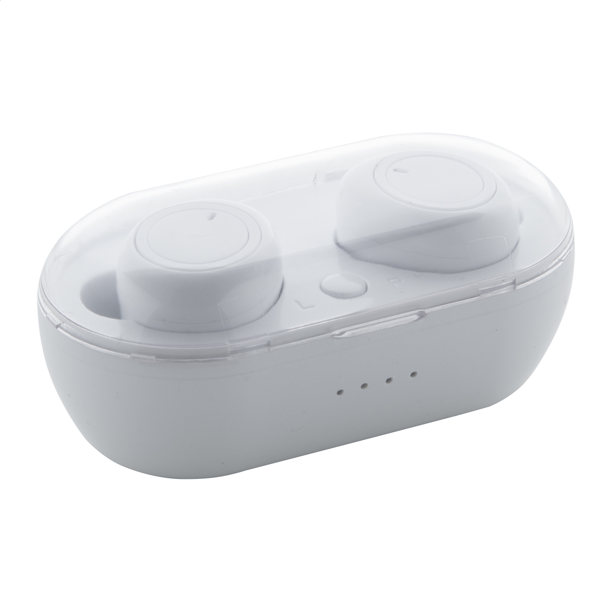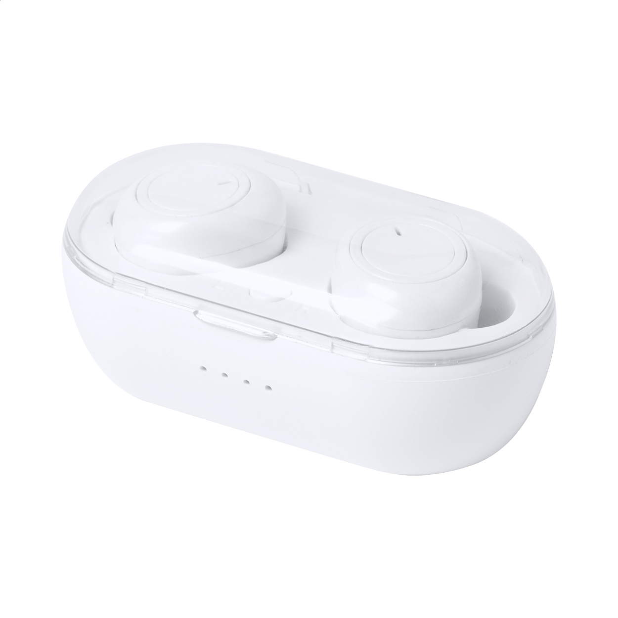 Căști stereo adevărate fără fir (TWS) cu funcție de apelare mâini libere în carcasă de plastic pentru încărcător. Inclusiv cablu de încărcare USB.