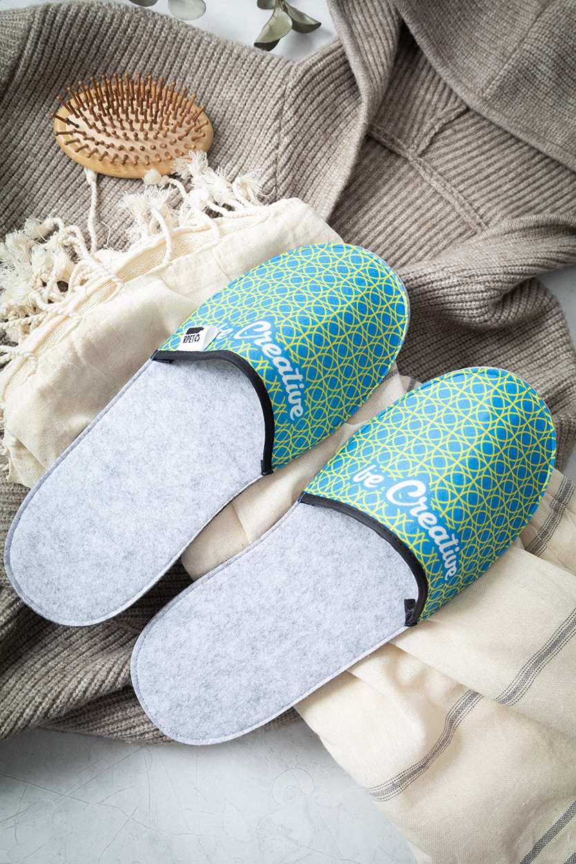Papuci de casă RPET, confecționați la comandă, cu top imprimat color și talpă anti-alunecare din cauciuc. Cu etichetă distinctivă RPET. Pretul include imprimarea prin sublimare. MOQ: 25 de perechi/dimensiune.