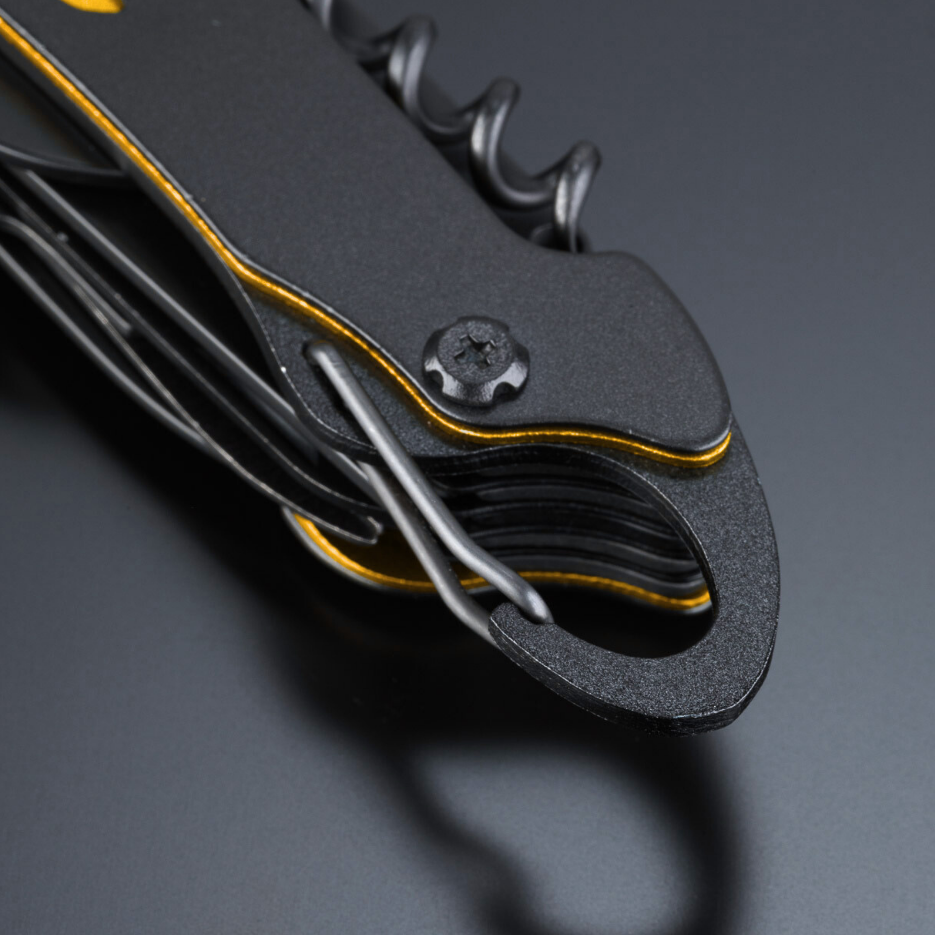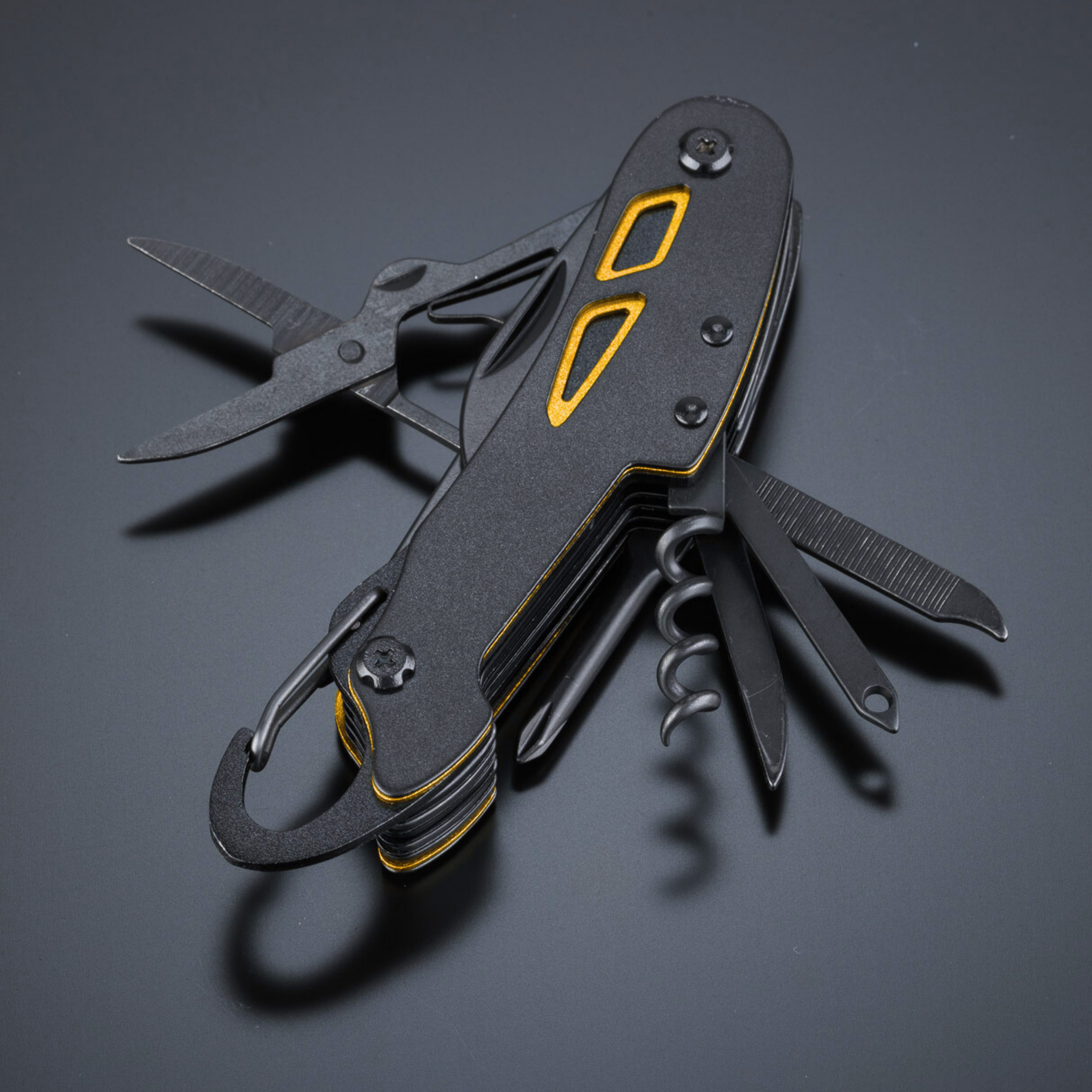 Briceag Optima într-o nouă înfățișare, fabricat din oțel inoxidabil de înaltă calitate cu un strat de titan pentru o duritate îmbunătățită și o rezistență suplimentară la coroziune. Inserții colorate pe mâner pentru o decorare subtilă. Caracteristici principale: foarfece, cuțit, ferăstrău pentru lemn, deschizător de sticle și conserve, racletă de pește, tirbușon, poanson (pentru perforarea, de exemplu, a unei conserve de suc), dispozitiv de filetare (pentru repararea tuburilor interioare, pentru coaserea plutelor cu pânze, repararea unei anvelope), pilă de unghii, șurubelniță în cruce. Briceagul se termină cu o carabină, astfel încât să îl puteți avea mereu la dumneavoastră.