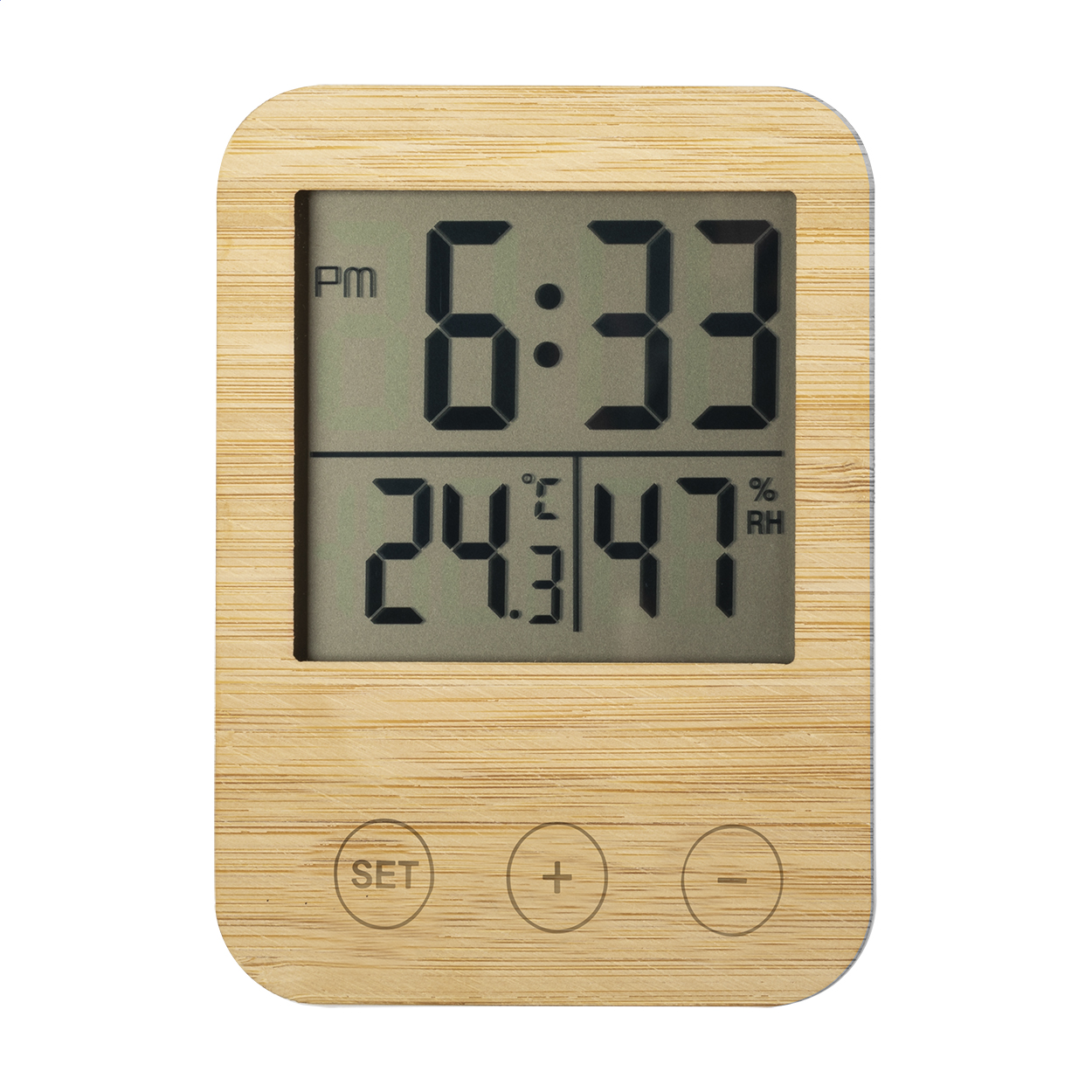 Ceas digital si stație meteo din bambus cu afișaj temperatură și umiditate.Funcționează cu 2 buc baterii AAA. Se livrează fără baterii.